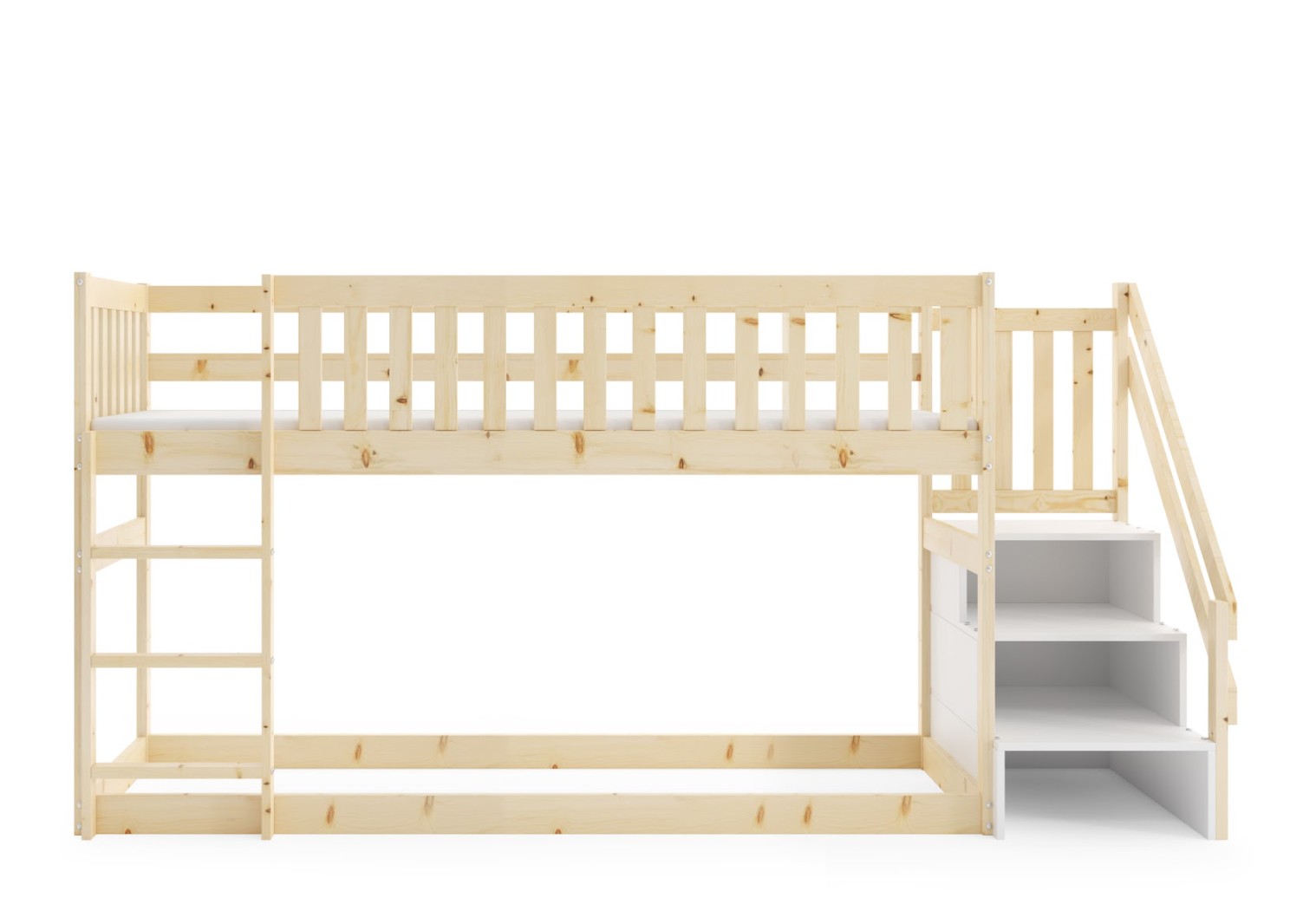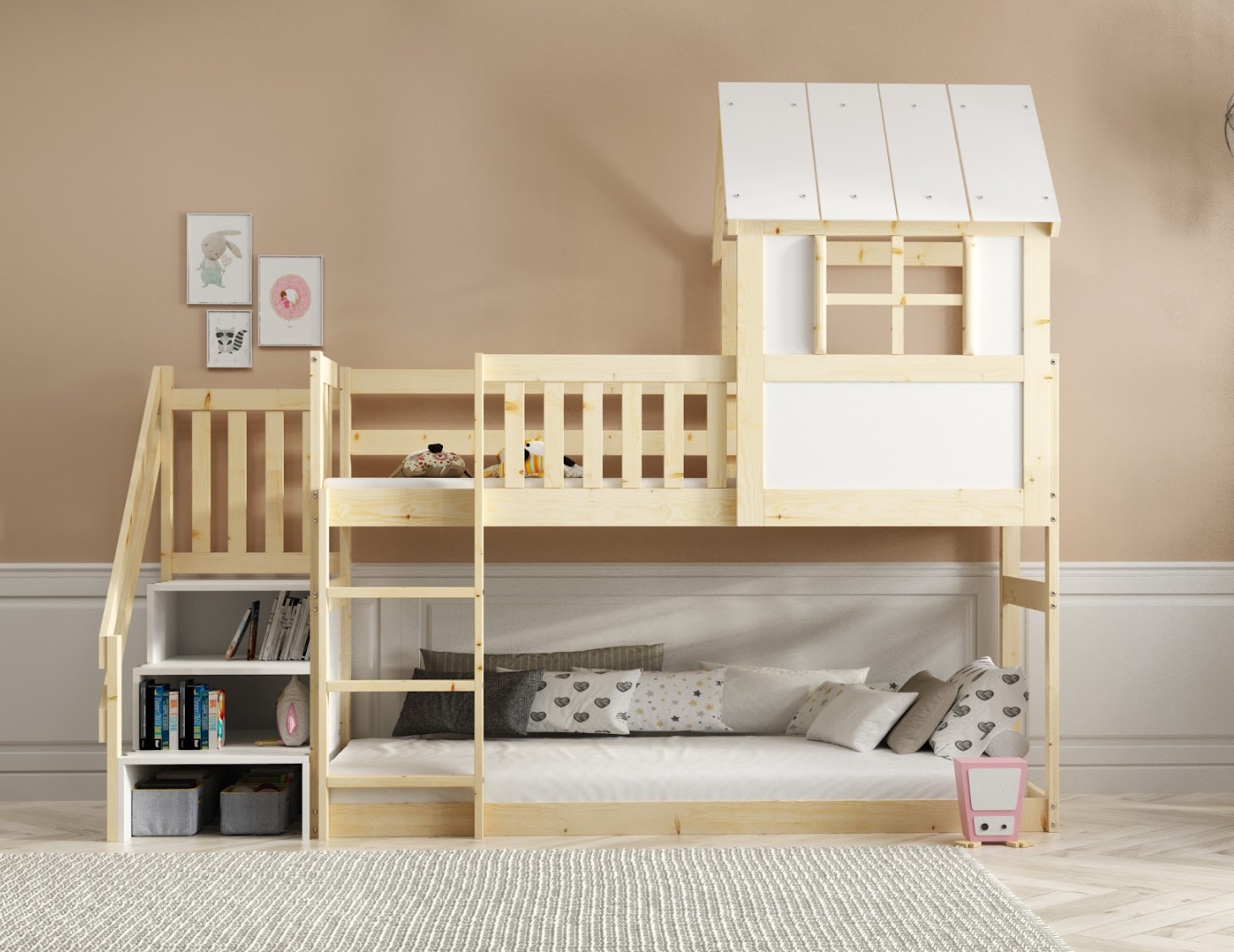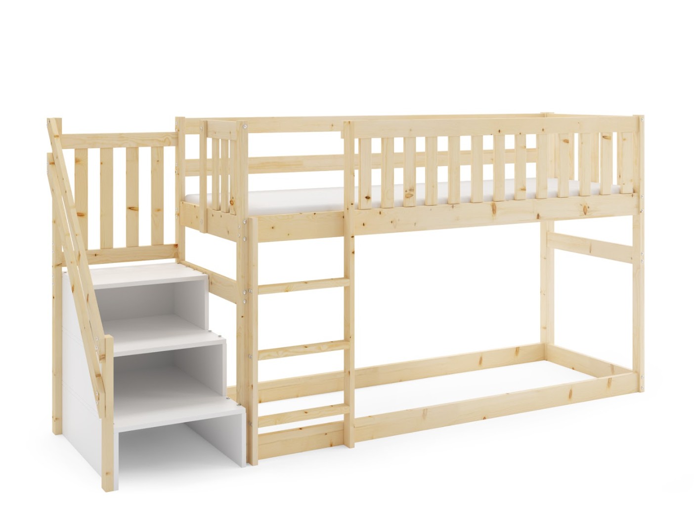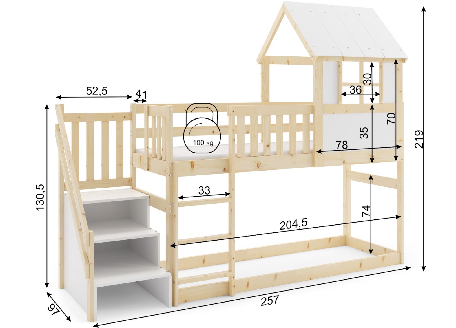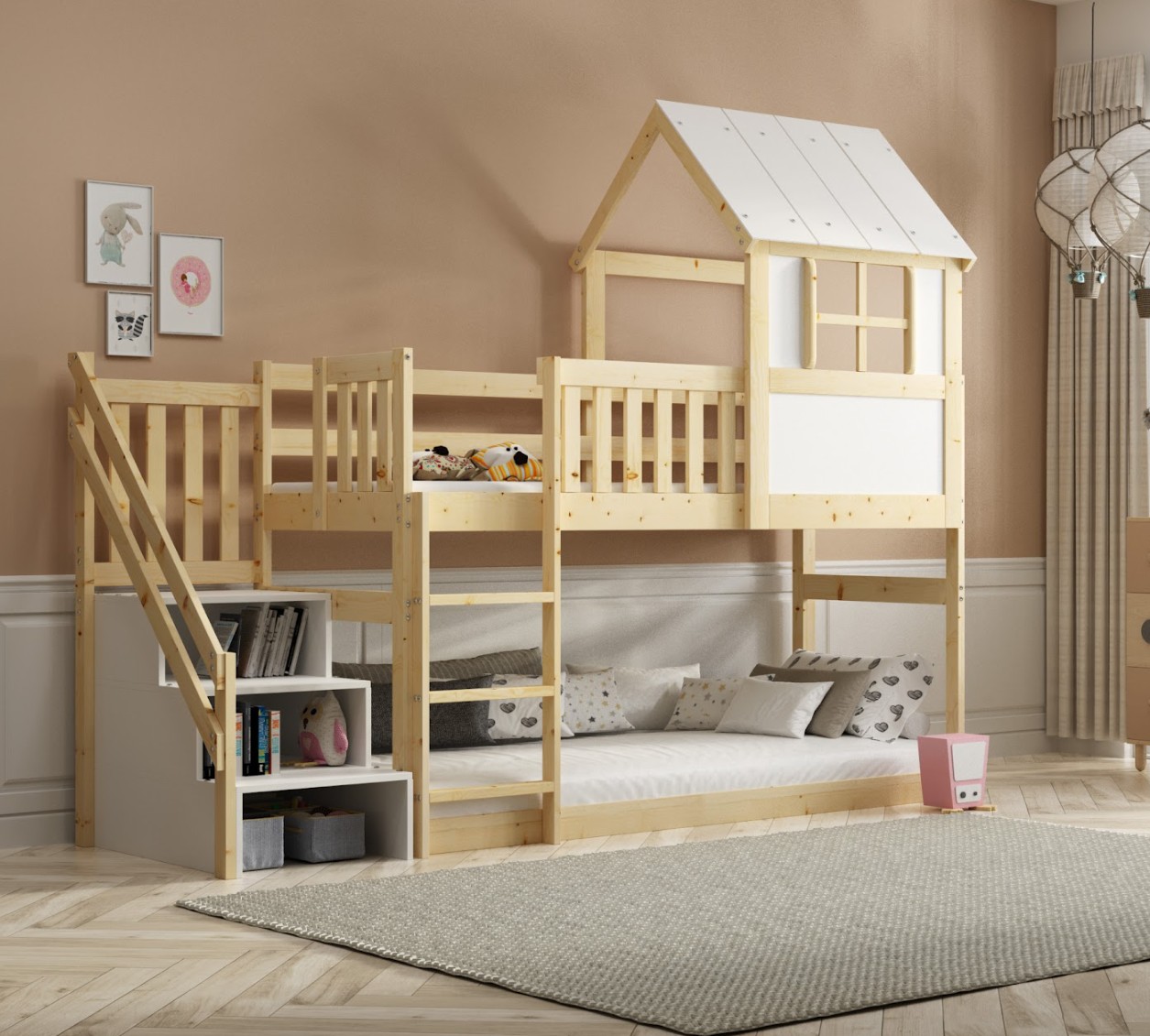 Detská vyvýšená posteľ ALTURA vám pomôže maximalizovať priestor detskej izby. Nielen, že krásne vyzerá a navodí príjemnú atmosféru, ale taktiež zaručí pohodlie a dobrý spánok. Vďaka tejto posteli môžete aj v malej miestnosti vytvoriť jedinečný priestor, ktorý splní všetky potreby a zaujme svojim jedinečným štýlom. Minimalistický, škandinávsky štýl postele Altura osloví všetkých ľudí, ktorí oceňujú modernosť a funkčnosť. Neutrálna farba postele sa hodí do chlapčenských i dievčenských izieb, kde sa stane dominantným prvkom. Rám postele je vyrobený z kvalitného masívneho borovicového dreva bez povrchových úprav, čo ponúka prirodzený vzhľad. Posteľ je ekologická, odolná a dá sa ľahko prispôsobiť - jej vzhľad môžete upraviť morením, lakovaním alebo maľovaním podľa vlastného uváženia. Vďaka vysokým zábranám je zaistená bezpečnosť dieťaťa počas spánku. Posteľ je dodávaná s rebríkom , ktorého montáž je možná na pravú aj ľavú stranu postele. Široké nášľapy zaručujú jednoduchý prístup na lôžko. Ďalšími doplnkami postele sú domček a schodíky , ktoré dodávajú posteli originálny vzhľad a atraktivitu. Domček navodí útulnú atmosféru a zároveň slúži ako ochranná bariérka proti vypadnutiu počas spánku. Schodíky s úložnými priestormi poslúžia nielen na jednoduchší prístup na horné lôžko, ale aj na ukladanie kníh, hračiek alebo dekorácií. Schodíky je možné umiestniť na pravú aj ľavú stranu. Konštrukcia postele je veľmi stabilná a vďaka zaobleným hranám sa stane bezpečným miestom na hranie, spánok aj relaxáciu vášho dieťaťa. Posteľ je dodávaná vrátane roštu pre horné lôžko. Priestor pod posteľou je možné využiť na hranie alebo ako ďalšie miesto na spánok s princípmi Montessori lôžka, kedy je umožnený voľný vstup aj výstup z postele. Rošt na spodné lôžko nie je súčasťou postele, je možné použiť matrac bez roštu. Vďaka nižšej konštrukcii je posteľ vhodná aj pre menšie deti.
