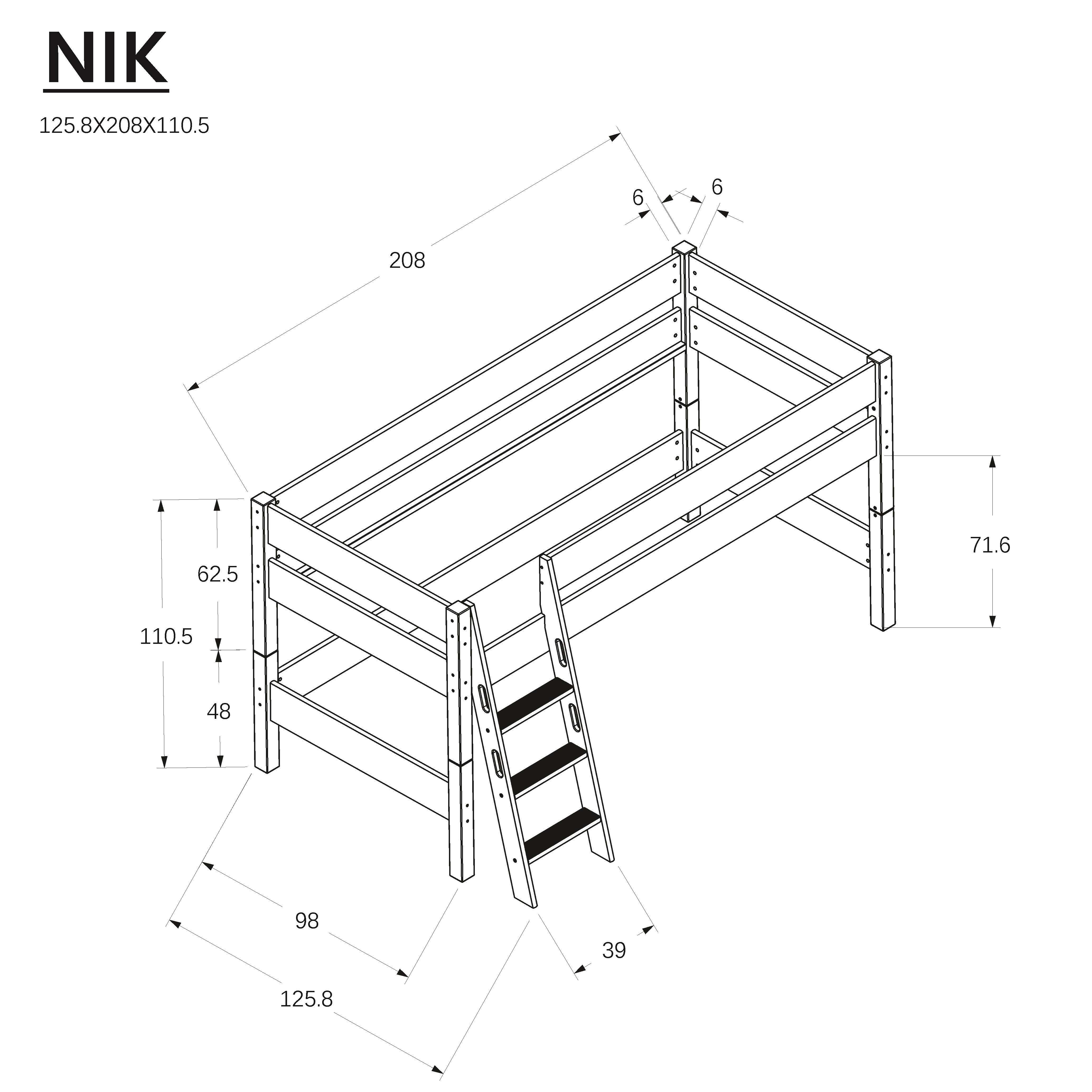 Toto vyvýšené jednolôžko je vysoko kvalitné a stabilné. Aby sa predišlo úrazom, sú hrany postele zaoblené. Rebrík má príjemne široké nášľapy s protišmykovým vrúbkovaním a diery po stranách rebríka pre prichytávanie sa. Lezenie na posteľ je teda pohodlné. Samozrejmosťou sú tiež zábrany proti spadnutiu po celom obvode lôžka.