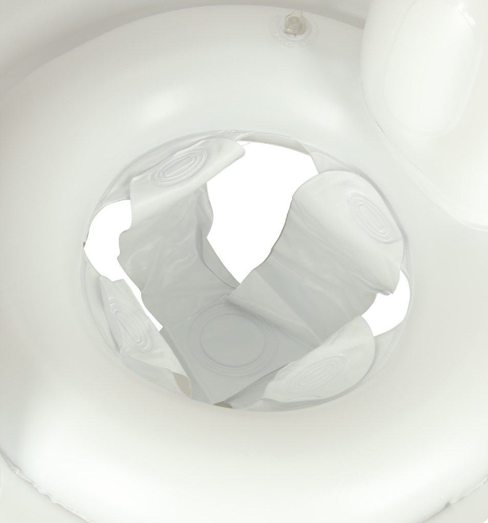 Kruh má priemer 62 cm a je vybavený pohodlným sedákom a otvormi na nohy pre stabilitu.