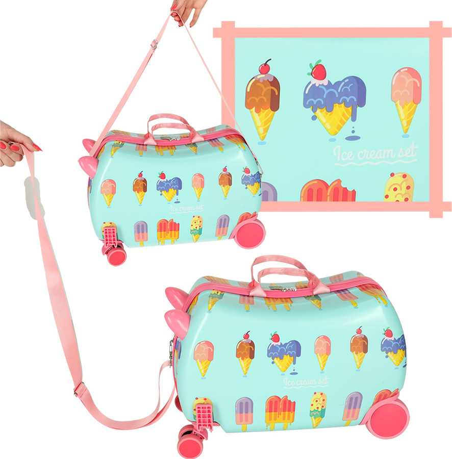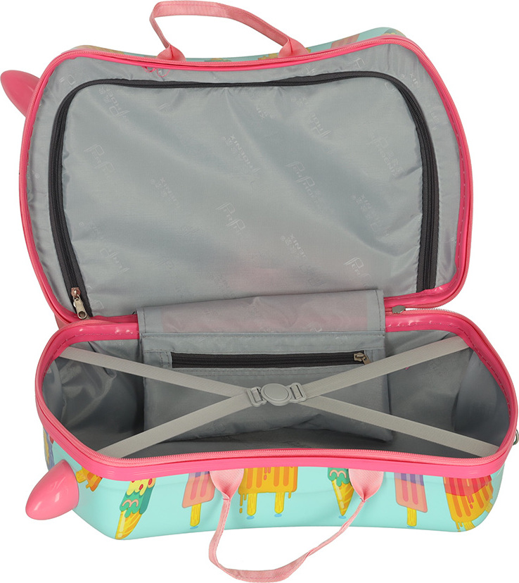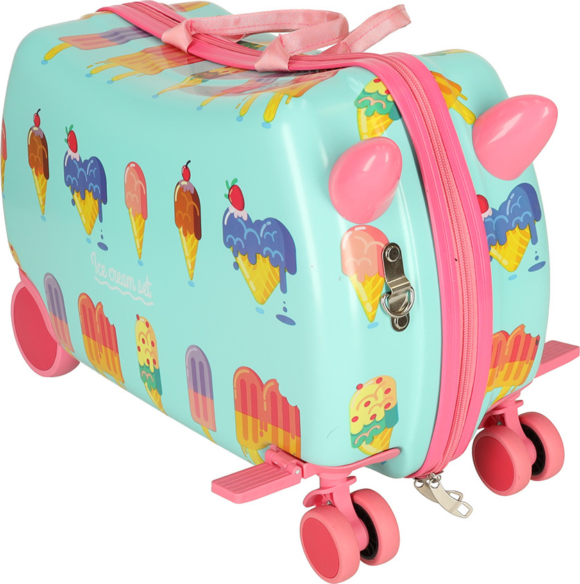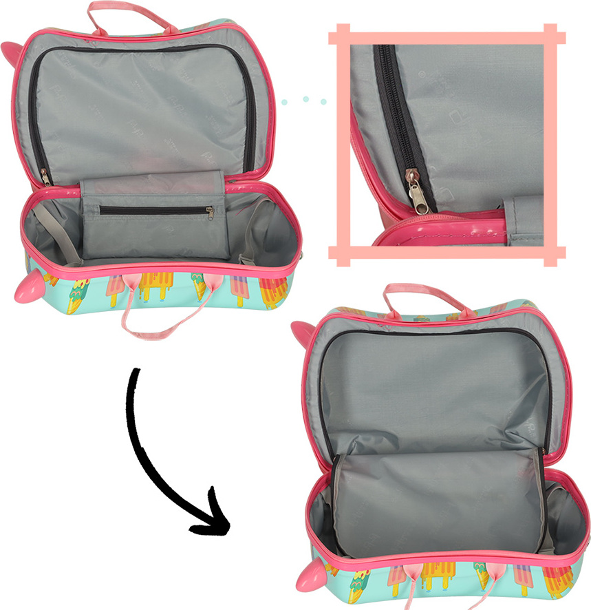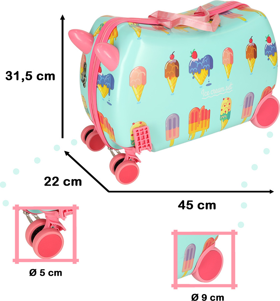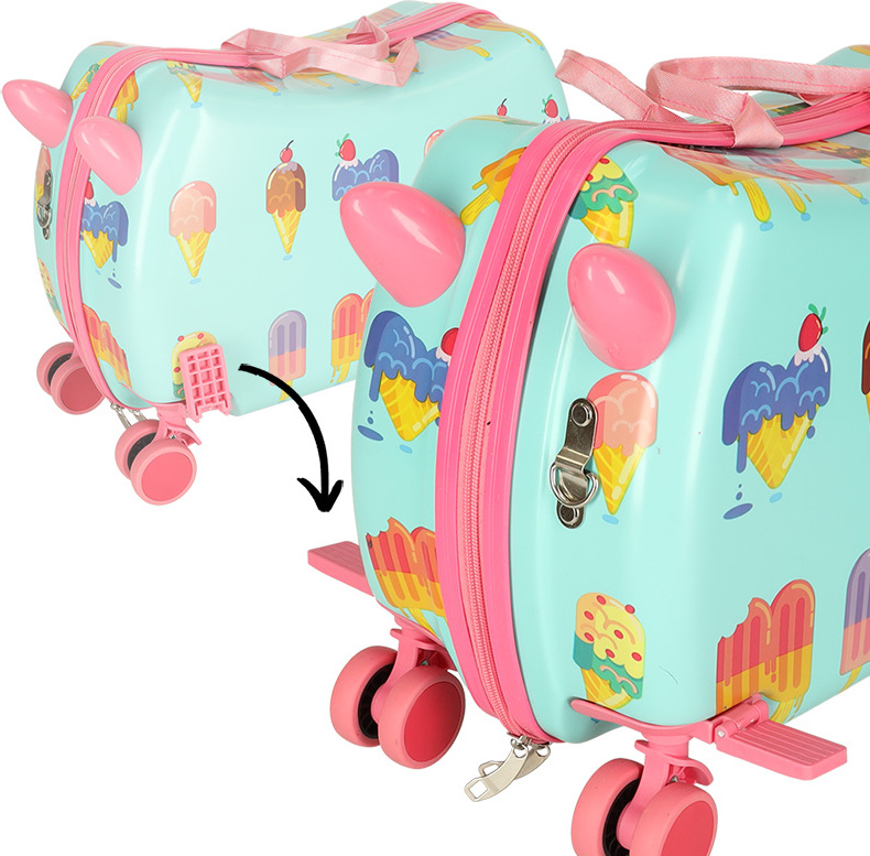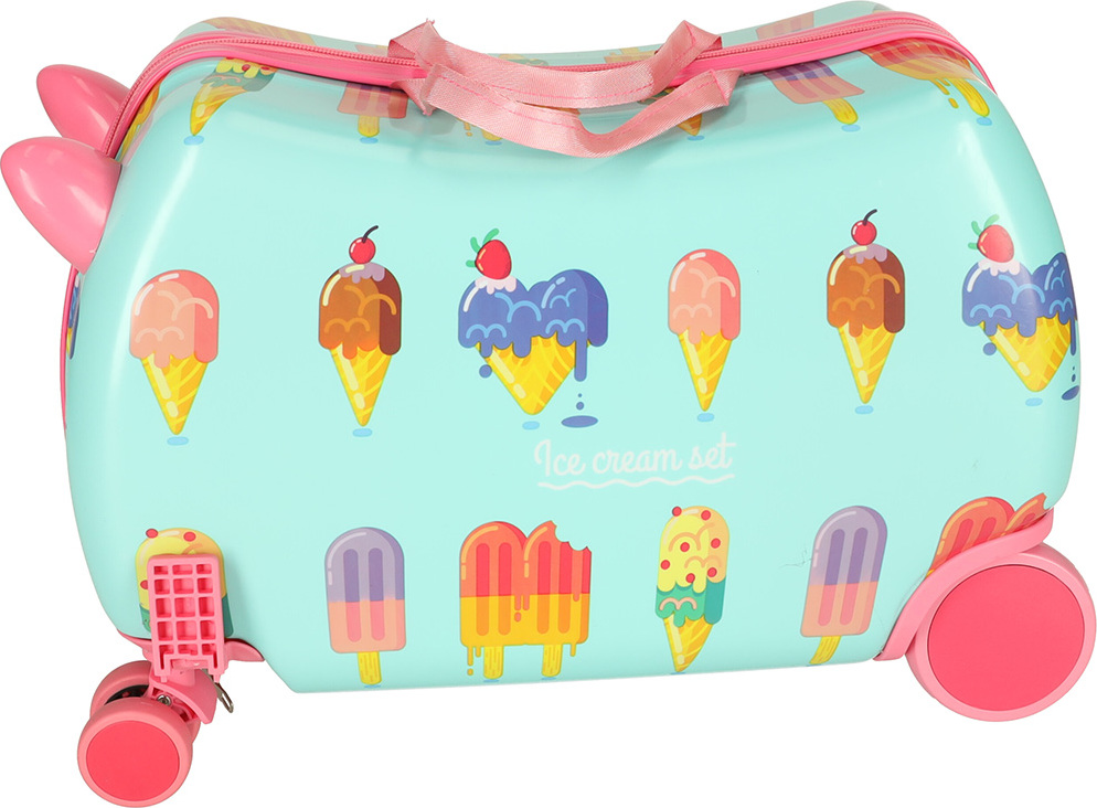 Tento detský kufor s motívom zmrzliny umožní najmenším cestovať štýlovo. Vďaka štyrom kolieskam sa s ním ľahko manipuluje, a to aj pri plnom naložení. Vnútri sa nachádzajú dve veľké priehradky a vrecko na drobnosti. Unikátnym prvkom sú opierky nôh, ktoré umožňujú unaveným deťom pohodlne sa usadiť na kufor a oddýchnuť si. Zapína sa na zips.