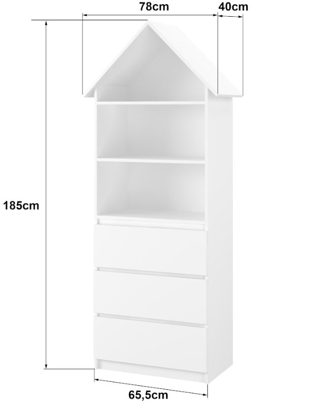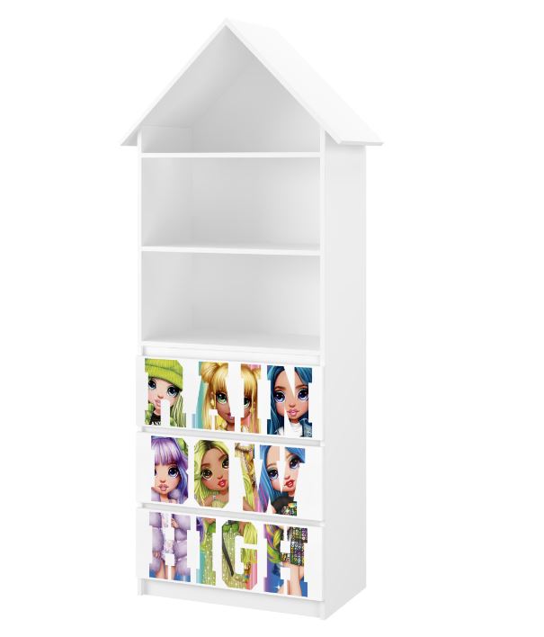 Tento úložný regál s motívom obľúbených postavičiek Rainbow High si zamiluje každá slečna. Regál má obľúbený tvar domčeka a krásny tlačený motív. Detský úložný regál je vyrobený z kvalitných lamino dosiek s hrúbkou 16 mm. Potlač má krásne sýte farby, ktoré sú zaistené špeciálnym laminátom s ochranou proti oderu a vyblednutiu. Regál je ľahko umývateľný. Priestranný regál ponúka tri otvorené police a tri šuplíky, ktoré pojmú mnoho kníh, hier alebo hračiek.