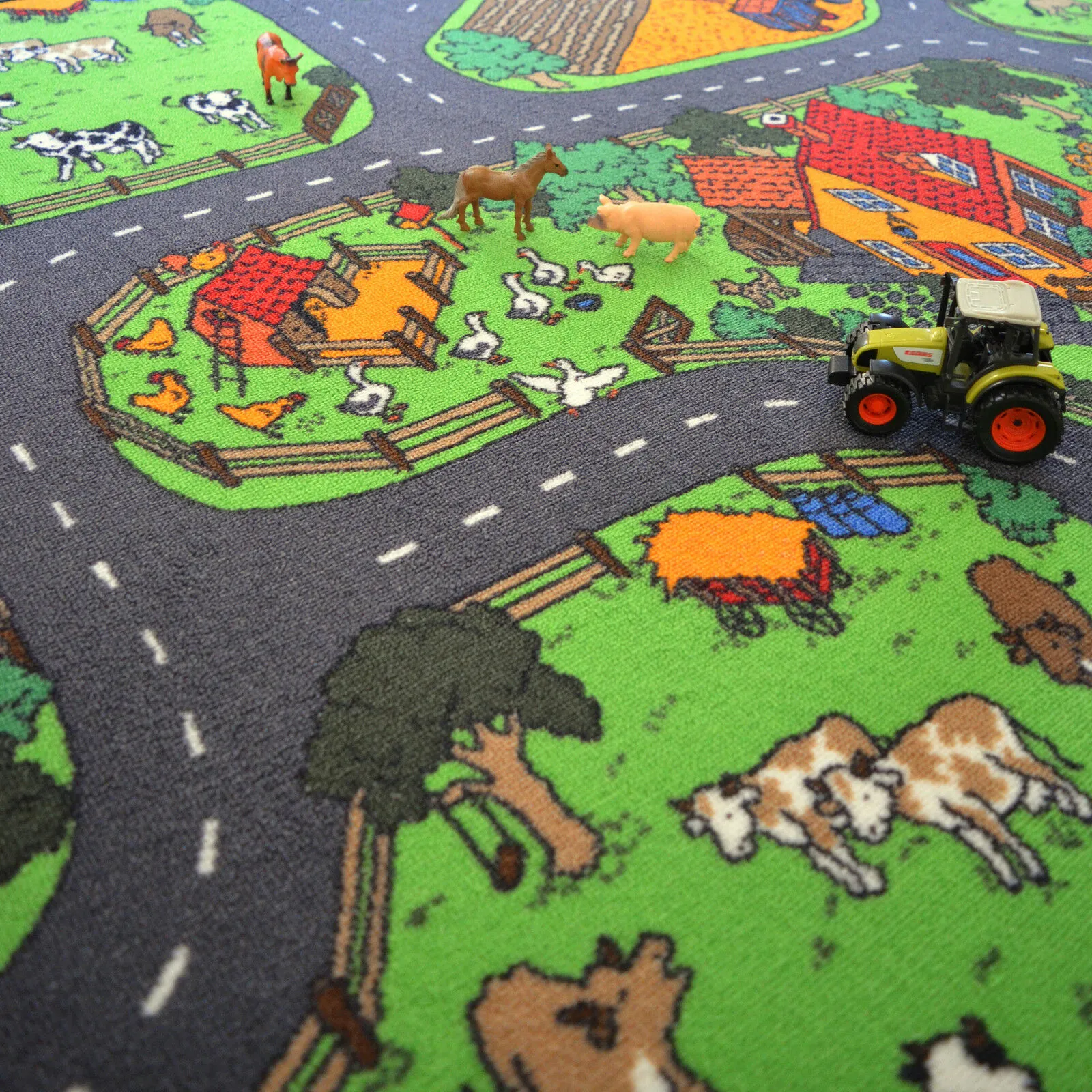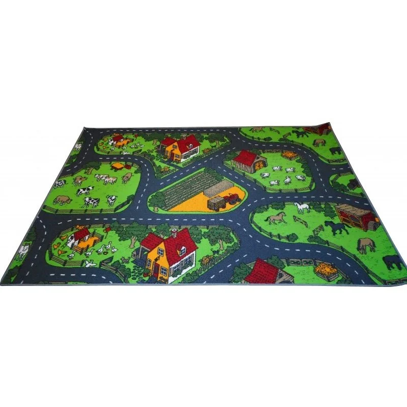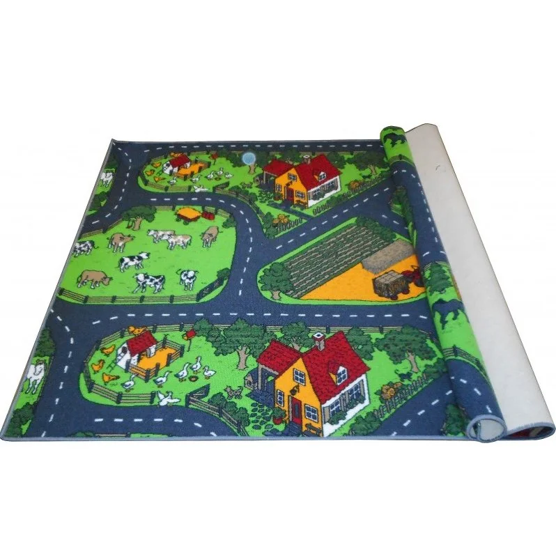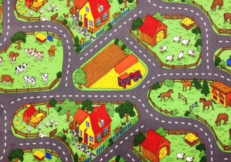 Detský kusový koberec Farma s uličkami a domy patria medzi koberce pre deti, ktorý zabaví na nespočet hodín. Na koberci môžete nájsť veľa ciest, farmárskych budov i zvieratiek. Koberec je veľmi príjemný na dotyk, ľahko sa udržuje, je odolný voči oderu, vyblednutiu farieb vplyvom slnečných lúčov, chemickým prostriedkom i moliam. Vyrobený je z polypropylénu, obšitie je z každej strany koberca. Koberec vlastné hygienický atest a je zdravotne nezávadný. Detské kusové koberce zo 100% polypropylénu patrí k najlacnejším kobercom na českom trhu, čo im ale neuberá na kvalite, a preto sa teší najväčšej popularite.