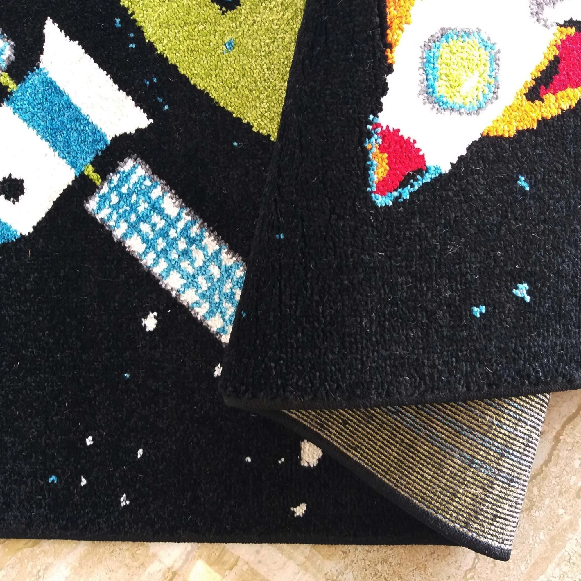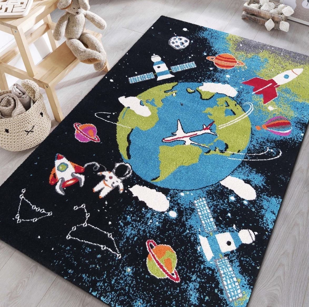 Krásny detský koberec s motívom vesmíru si zamiluje každý malý kozmonaut a vesmírny objaviteľ. Prednosťou koberca sú krásne sýte farby odolné voči vyblednutiu. Koberec je vyrobený z pružného polypropylénového vlákna, ktoré mu zaručuje odolnosť voči deformáciám aj pri internivznom používaní. Koberec je navyše mäkký a veľmi príjemný na dotyk.