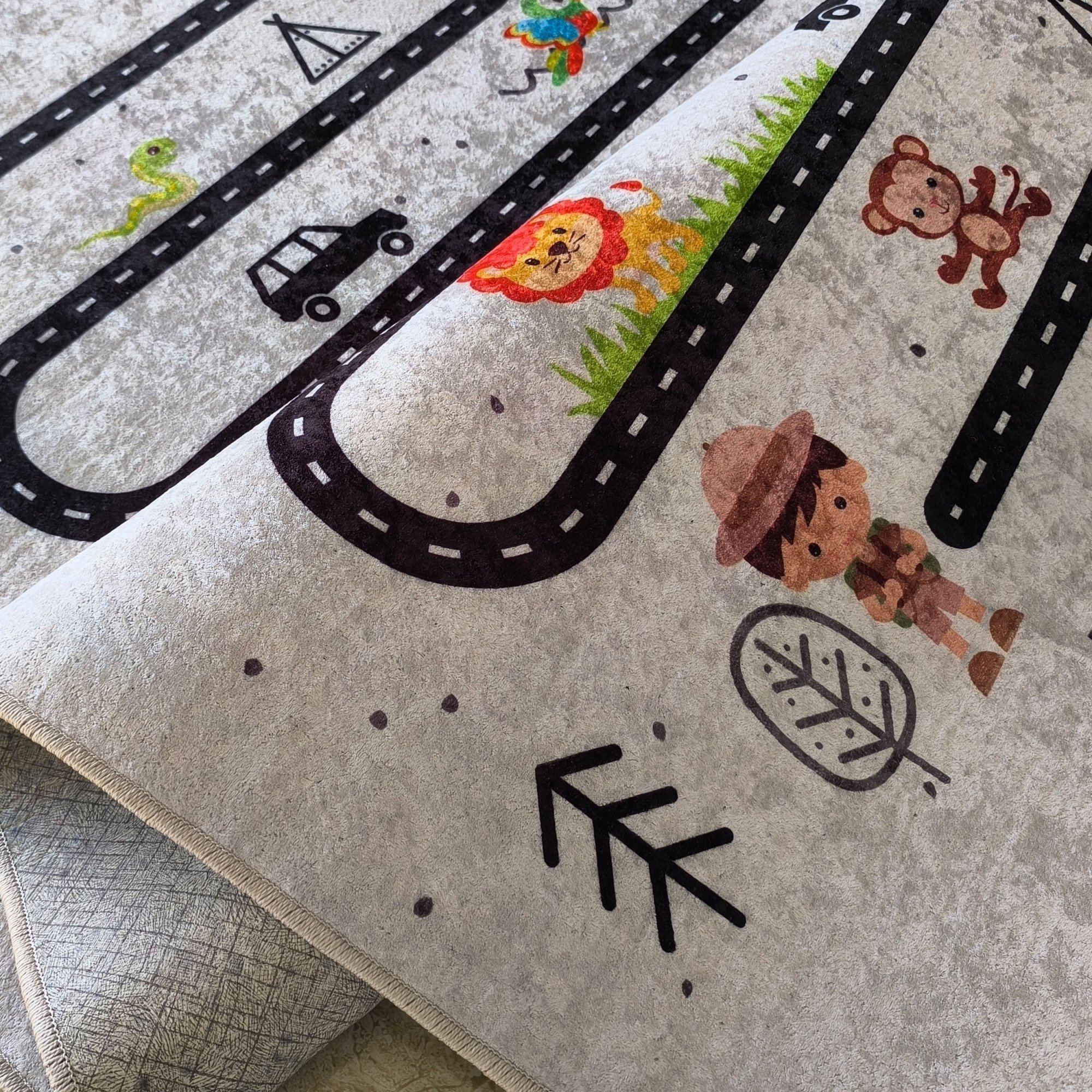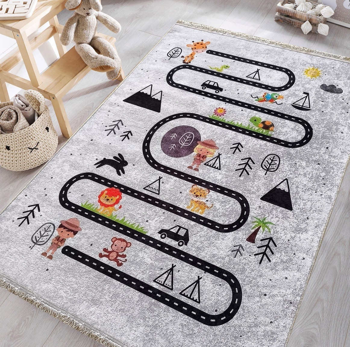 Koberec Honor New Putování za zvířátky je okouzlující a roztomilý koberec do dětského pokoje. Vyberte si tento model, pokud hledáte zajímavý a nekonvenční nápad na koberec do dětského pokoje! Tento dětský koberec se vyznačuje originálním barevným schématem. Krásné šedé odstíny jsou kombinovány s jemnými barvami a napříč kobercem vede cesta, na které si děti mohou hrát s autíčky. Tento koberec bude krásným doplňkem dětského pokoje, zejména v moderním interiéru ve skandinávském stylu nebo v místnosti zařízené v bílé, šedé nebo béžové barvě.