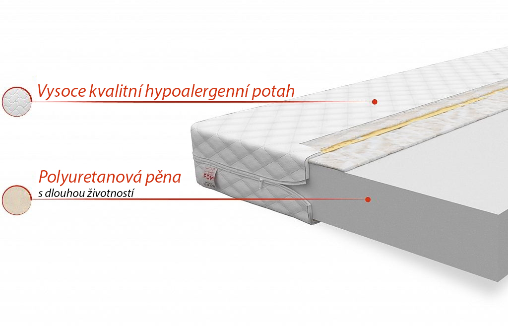 Zloženie matraca: T25 polyuretánová pena (PUR pena) najvyššej kvality s hustotou 25 kg / m3