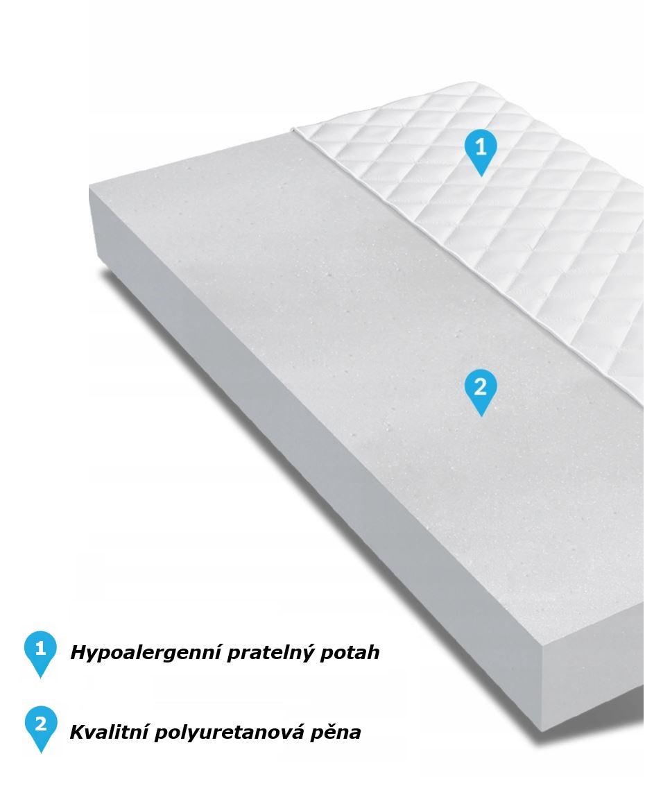 Polyuretánová PUR pena - Poskytuje priedušnosť, trvanlivosť, ochranu proti nadmernej oxidácii a preležaniu. Vďaka svojej konštrukcii si zachováva vynikajúce ortopedické vlastnosti a vysokú úžitkovú hodnotu. Pôsobí veľmi pozitívne na celkovú regeneráciu organizmu a uvoľnenie svalstva.
