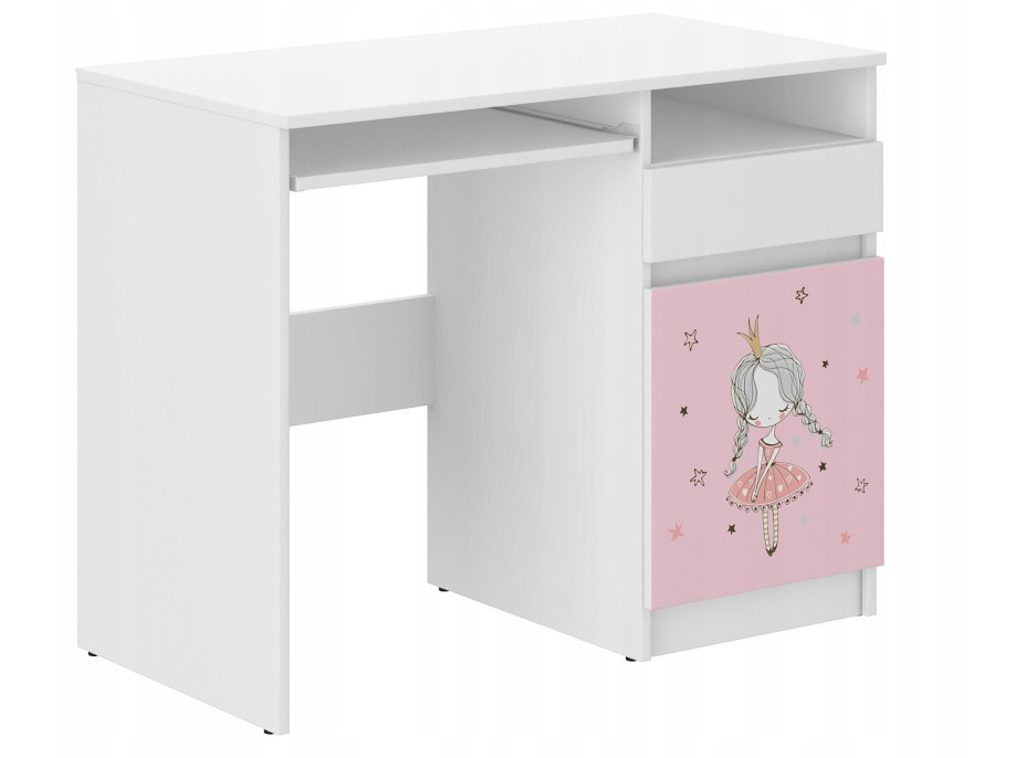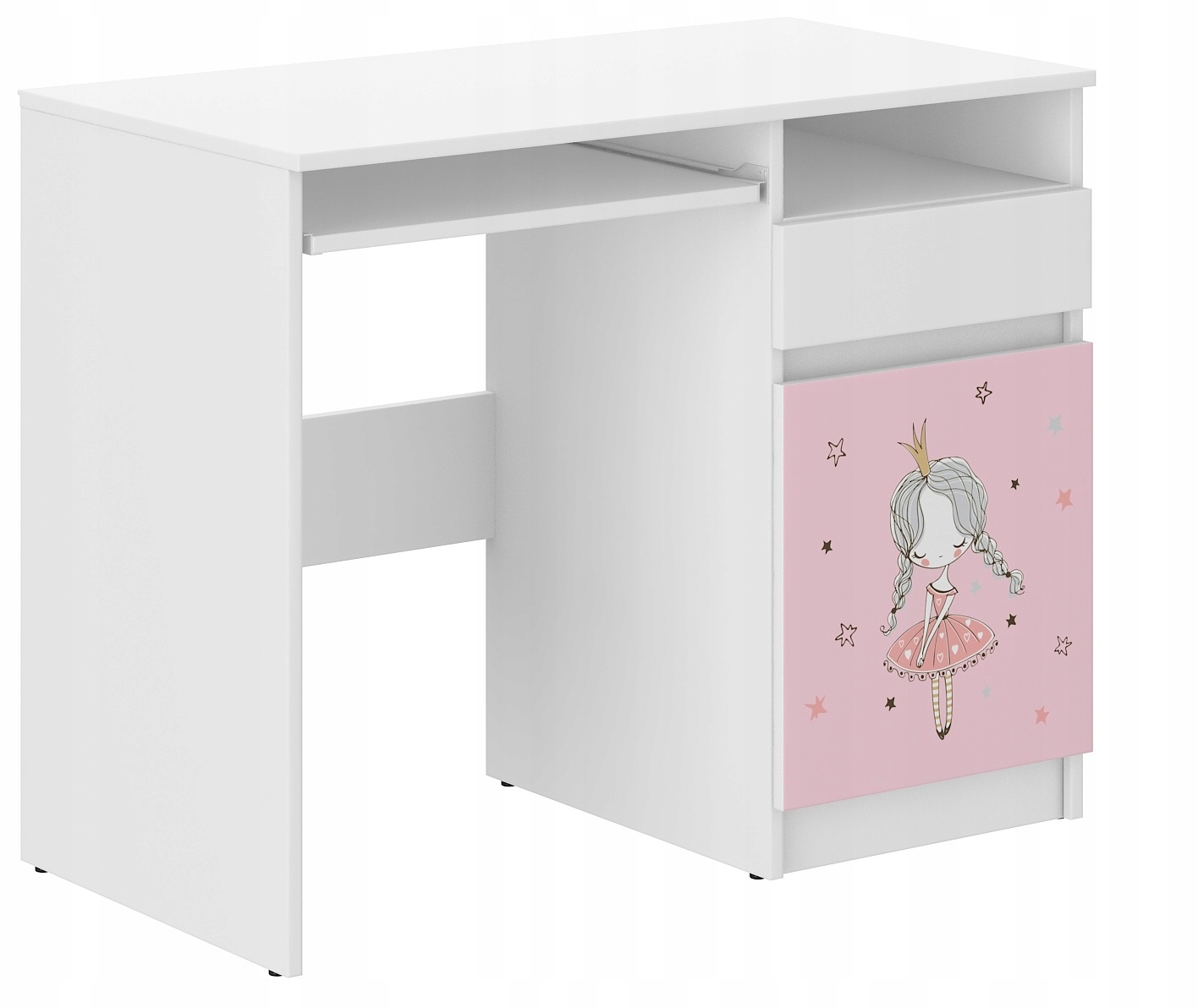 Písací stôl je rozdelený na ľavú časť, kde nájdete priestor pre zasunutie stoličky a výsuvnú poličku nad nohami, ktorá je ideálna napríklad na klávesnicu k počítaču a pravú odkladaciu časť, kde hornej časti dominuje zásuvka a spodnej časti dominuje otváracia priestranná skrinka bez poličiek. Čelá dvierok majú nádherný tlačený motív, ktorý je prekrytý ochranným laminátom. To zaisťuje vysokú odolnosť a dlhú životnosť potlače aj pri čistení vlhkou handričkou. Zásuvky sú uložené na pojazdoch so zarážkami, čo zabraňuje úplnému vytiahnutiu zásuvky.