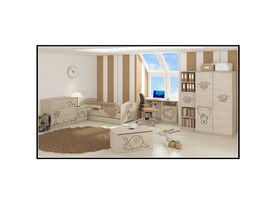 K vytvoreniu vyrezávaných detských vzorov na čelnej strane tohto písacieho stola bola použitá vycibrená technológie trojrozmerného gravírovanie. V kombinácii s vysoko kvalitným opracovaním MDF dosky s hrúbkou 16 mm tak nábytok získava úplne unikátne dizajnové efekty, ktoré ocenia aj tí najmenší. Trojrozmerné vzory u detí otvárajú tiež nové brány predstavivosti tým, že dieťa zájde prsty do reliéfu vzorov a dôjde tak u neho k predstavivosti nielen pomocou zraku, ale tiež vďaka hmatu. Táto jedinečná technológia sa tak stáva zdrojom zábavy i rozvoja vášho dieťaťa. Nábytok je ošetrený nezávadným ekologickým lakom, ktorý neohrozuje zdravie vášho dieťaťa.