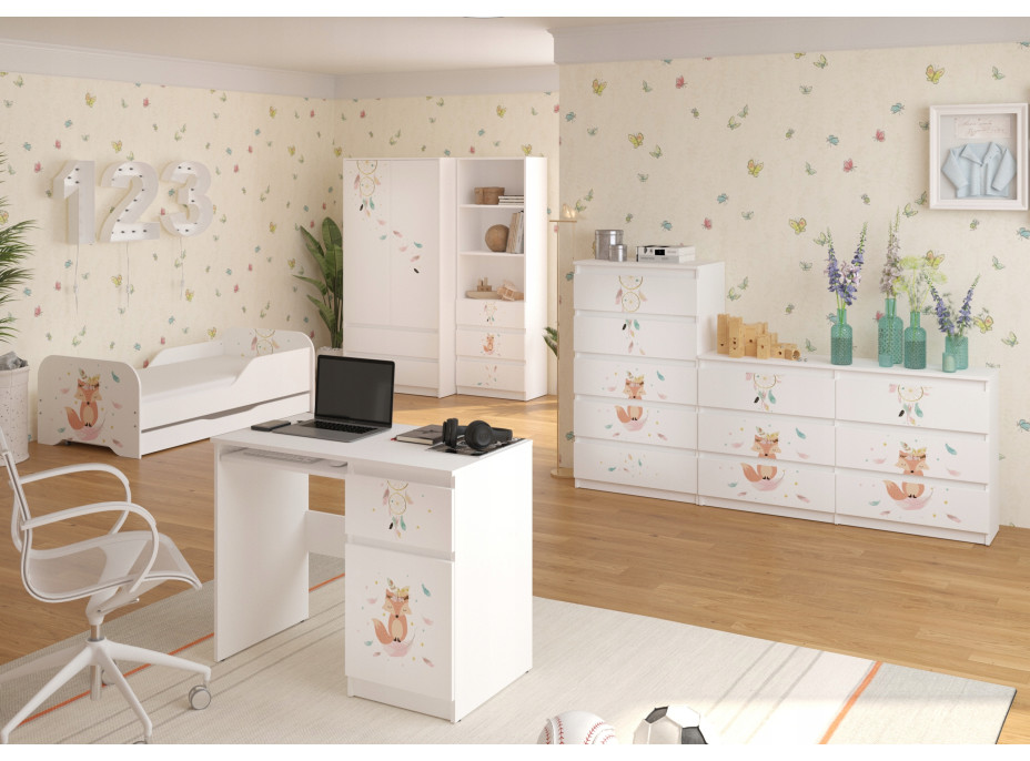 Regál je rozdelený na hornú otvorenú časť s 3 policami a na spodnú časť s 3 zásuvkami, čo ho robí ideálnym pre vytvorenie knižnice, vystavenie obľúbených hračiek či ako skladovací priestor. Čelá zásuviek majú nádherný tlačený motív, ktorý je prekrytý ochranným laminátom. To zaisťuje vysokú odolnosť a dlhú životnosť potlače aj pri čistení vlhkou handričkou. Zásuvky sú uložené na pojazdoch so zarážkami, čo zabraňuje úplnému vytiahnutiu zásuvky.