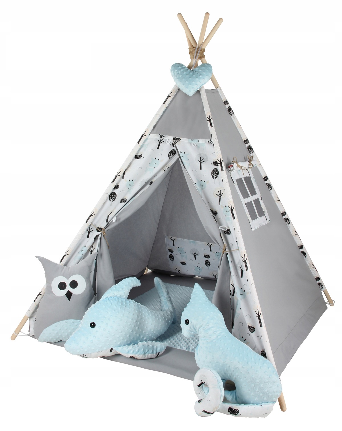 Detský stan TEEPEE (TÍPÍ) ZVIERATÁ s doplnkami - Les - šedo/modrý