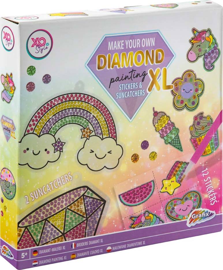 2 listy samolepiek (12ks), 2ks lapače slnka vr.závesu, farebné kamienky označované ako „diamanty“, aplikátor, zásobník s lievikom, vosková podložka.