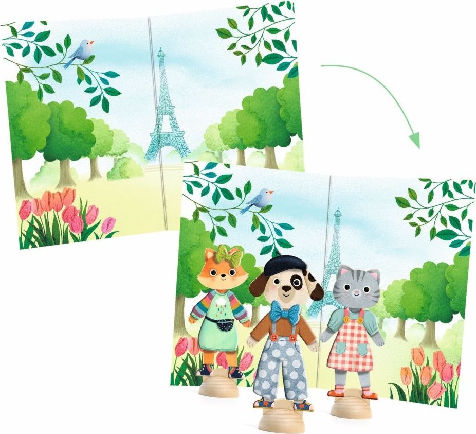 Obliekacia kolážová aktivita, pri ktorej môžete 3 drevené postavičky prezliekať do viac ako 45 kusov oblečenia.