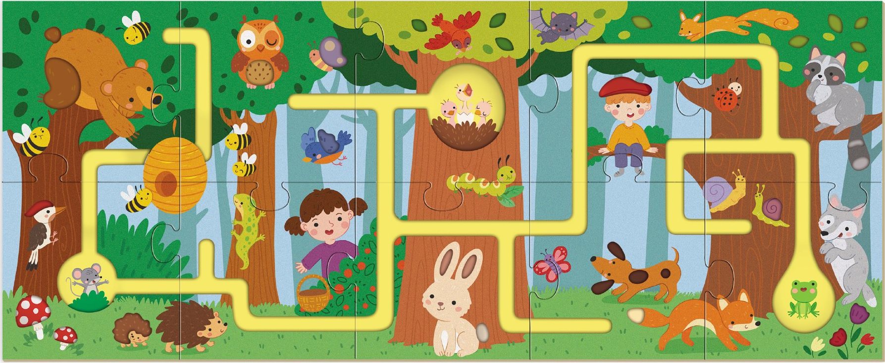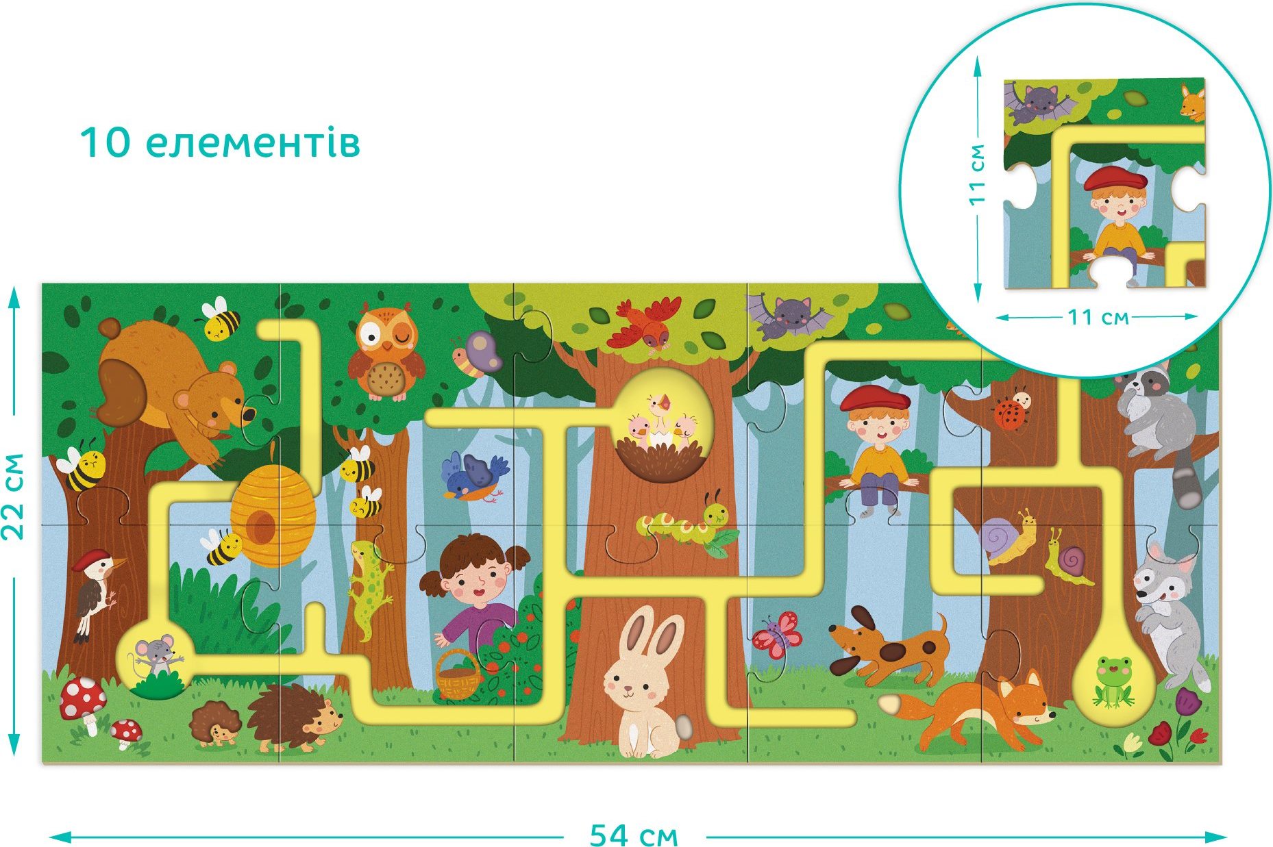 Dodo puzzle-labyrint „Moja lesná cesta“ – objavujte les hravou formou! Interaktívne puzzle „Moja lesná cesta“ s 10 prvkami tvorí labyrint so špeciálnymi drážkami, po ktorých dieťa môže viesť prst a prechádzať trasu lesom. Ilustrácia ukazuje veveričky, zajačikov, ježkov, vtáčiky a ďalšie zvieratá, ktoré dodávajú hre kúzlo. Dieťa objavuje detaily a spoznáva lesných obyvateľov. Puzzle rozvíja jemnú motoriku, koordináciu, pozornosť a predstavivosť. Ideálne pre deti od 2 rokov. Hravé učenie a zábava v jednom!