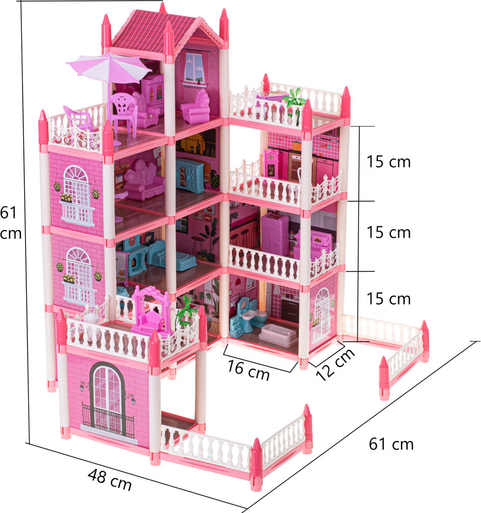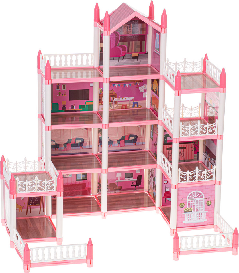 V dome sú až 4 poschodia, ktoré si môžete vyzdobiť podľa vlastného návrhu. Vďaka tomu, že je dom postavený svojpomocne, môžete sa s dieťaťom rozhodnúť, kde budú jednotlivé miestnosti, a že ich je veľa: obývacia izba, pracovňa, kuchyňa, kúpeľňa, šatňa, detská izba. Konečné využitie miestností je však na vás! Všetky steny a strecha domčeka sú v obľúbenej farbe detí - ružovej! Okrem toho sú vnútorné steny opatrené grafikou s mnohými kusmi nábytku a dekoráciami, ktoré sú nevyhnutné v každej domácnosti, čo dodáva domčeku realistickejší vzhľad. Veľké množstvo nábytku uľahčí usporiadanie interiéru a urobí domček vhodnejším pre bábiky.