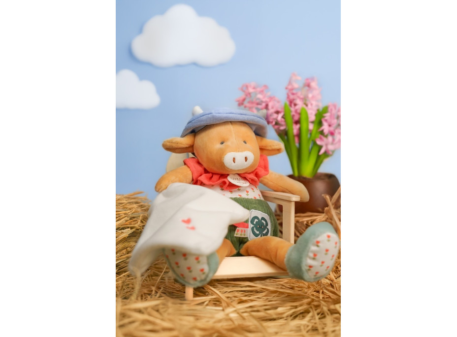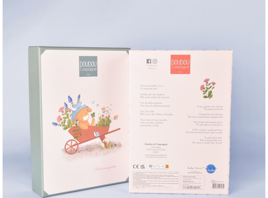 Plyšová kravička Aneth s dečkou o veľkosti 28 cm z kolekcie „Moja záhrada“ je vyrobená z mäkkých prémiových materiálov. Má roztomilú tvár, modrý klobúčik a hebkú dečku a kombinácia rôznych farieb a textúr stimuluje zmysly a rozvíja jemnú motoriku bábätka. Nabáda na skúmanie a maznanie a dieťa zabaví aj upokojí. Je zabalená v peknej darčekovej krabičke na uloženie spomienok (fotografia a ďalšie pripomienky narodenia a rozvoja bábätka) s veršovaným textom v angličtine na spodnej strane. Ideálny darček pre akúkoľvek príležitosť. Kolekcia hračiek „In my garden“ – Moja záhrada je inšpirovaná prírodou. Hračky sú zabalené v atraktívnych darčekových krabičkách ilustrovaných akvarelom a pripomínajú rôznorodosť a farby záhrady, čo je podčiarknuté aj ich menami ako je Ciboulette (pažítka), Aneth (kôpor) a ďalšie.