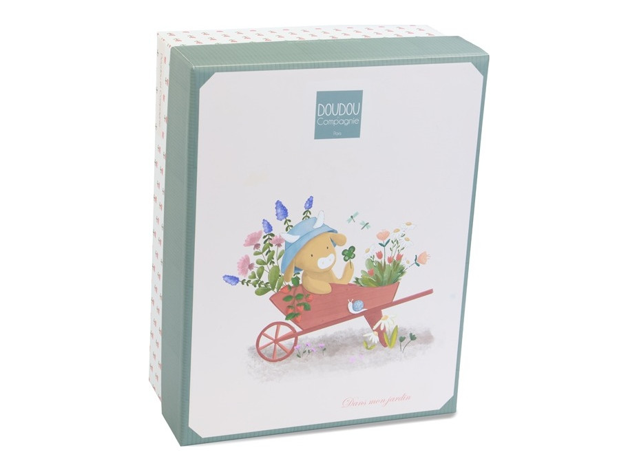 Muchláčik kravička Aneth o veľkosti 27 cm z kolekcie „Moja záhrada“ je vyrobený z prémiového materiálu. Má roztomilý modrý klobúčik a kombinácia rôznych farieb a textúr stimuluje zmysly a rozvíja jemnú motoriku. Nabáda na skúmanie a maznanie a dieťa zabaví aj upokojí. Je zabalený v peknej darčekovej krabičke na uloženie spomienok (fotografie a ďalšie pripomienky narodenia bábätka) s veršovaným textom v angličtine na spodnej strane. Ideálny darček pre akúkoľvek príležitosť. Kolekcia hračiek „In my garden“ – Moja záhrada je inšpirovaná prírodou. Hračky sú zabalené v atraktívnych darčekových krabičkách ilustrovaných akvarelom a pripomínajú rôznorodosť a farby záhrady, čo je podčiarknuté aj ich menami ako je Ciboulette (pažítka), Aneth (kôpor) a ďalšie.