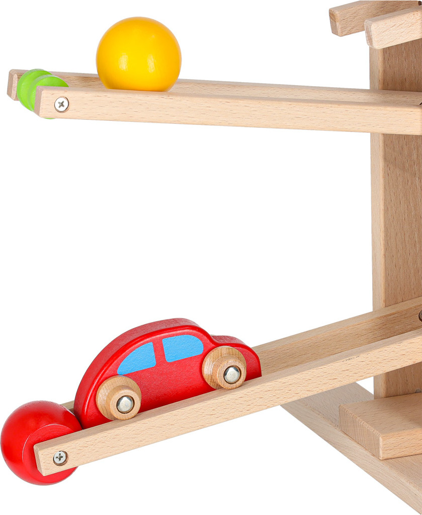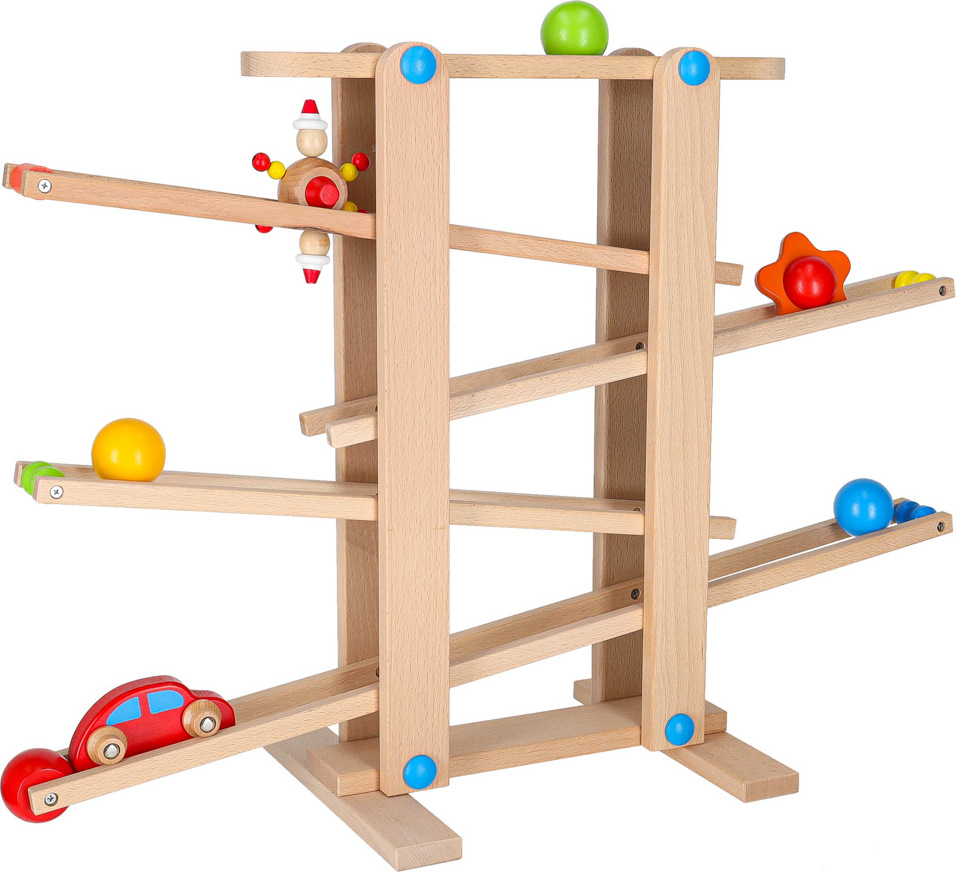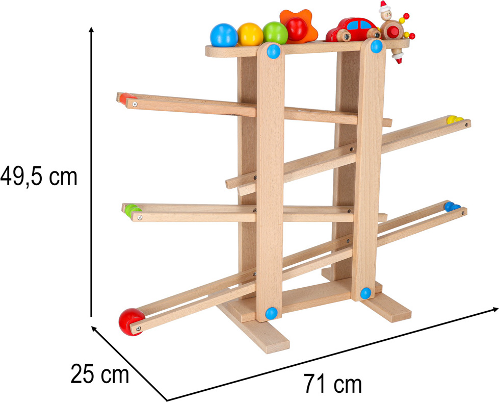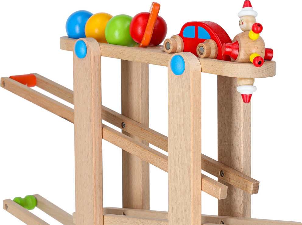 Táto fantastická drevená dráha s guličkami a autíčkami poteší každého malého objaviteľa. Prijmite výzvu a usporiadajte súťaž - zistite, ktorá lopta bude rýchlejšia. Po ceste na vás čakajú vzrušujúce skoky z jedného poschodia do druhého. Sledujte presnosť guličiek a autíčok pri prejazde dráhou.