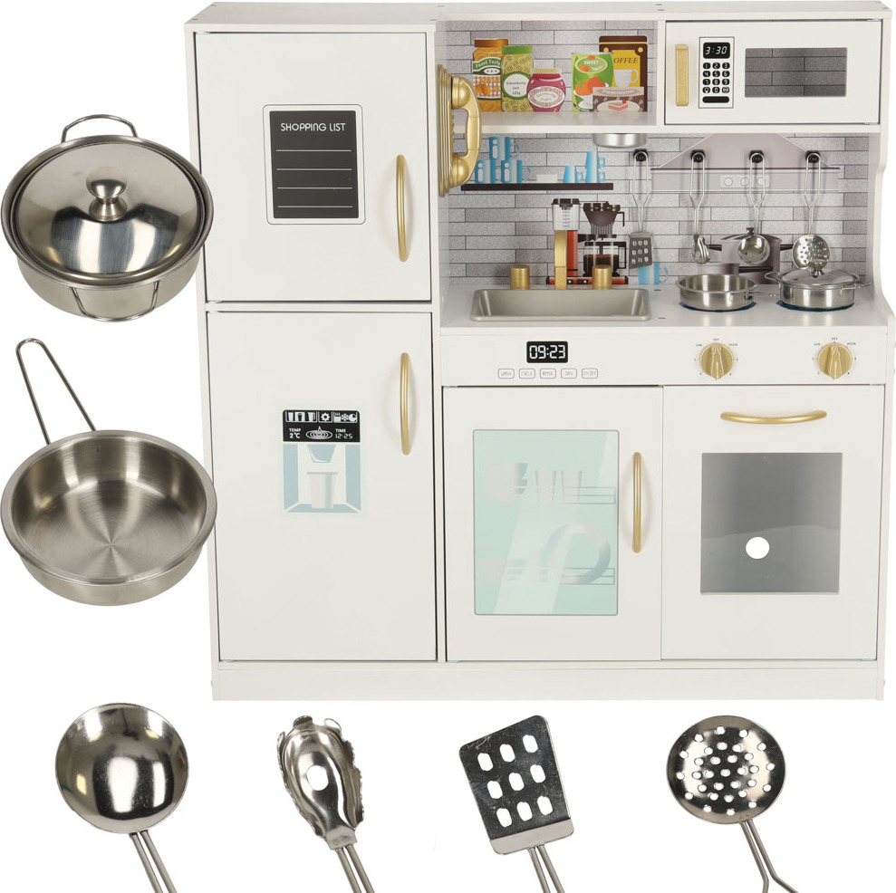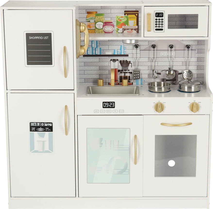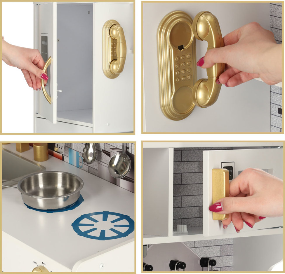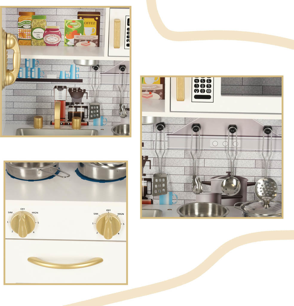 Biela farba kuchynky so zlatými prvkami dokonale splynie s každou detskou izbou a poskytne mu nielen priestor na hranie, ale aj výraznú dekoráciu. Kuchynka bola vyrobená z masívneho a hladko brúseného dreva , takže si môžete byť istí, že vydrží veľa varenia, ktoré vaša ratolesť usporiada. A odolné budú aj kovové doplnky.