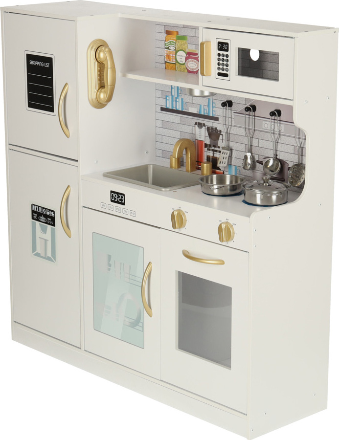 Kuchynka sa skladá z chladničky s mrazničkou, umývačky riadu, mikrovlnnej rúry, sporáka a rúry - všetkého nevyhnutného vybavenia na prípravu chutných jedál . Navyše majú ďalšiu grafiku, aby vyzerali čo najrealistickejšie - tlačidlá na mikrovlnnej rúre, nákupný zoznam na chladničku, hodiny a riad v umývačke. Na chladničke visí telefón, ktorý je na ideálnom mieste na zavolanie mamičke alebo babičke pre tajný rodinný recept. Okrem mnohých spotrebičov sada obsahuje aj príslušenstvo, ktoré je pri varení nemenej dôležité - hrniec, panvicu a ďalšie náčinie .
