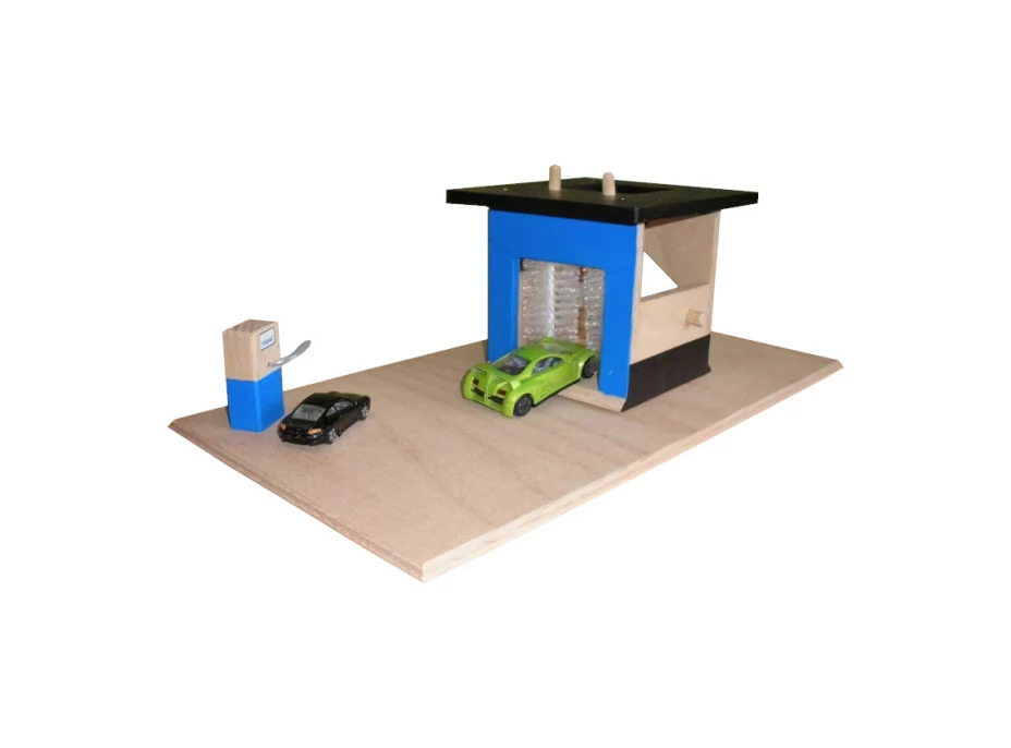 Autíčka typu "angličiak" vyjdú z garáží a hneď zabočia tankovať - môže si vybrať, ktorý benzín alebo naftu. Tiež si môže dofúknuť pneumatiky. Všetky stanovištia sú funčné, len benzín netečie. Jednoduchá hračka pre chlapcov s fantáziou.
