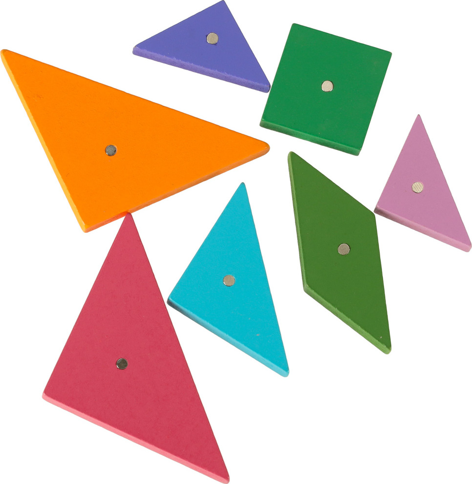- sedem drevených farebných geometrických obrazcov s magnetmi