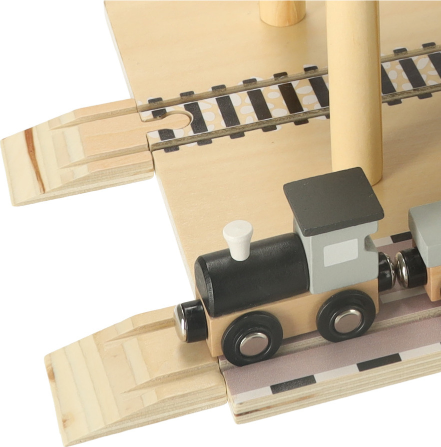 Drevený prístavný žeriav s autíčkom, vláčikom a loďou