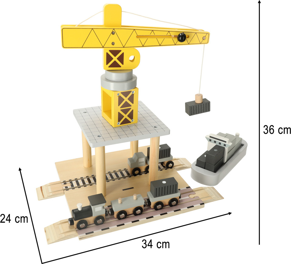 Drevený námorný prístav so žeriavom je skvelá hračka pre malých nadšencov do dopravy a stavebníctva. Sada sa skladá zo žltého prístavného žeriava, ktorým je možné otáčať a zdvíhať kontajnery z lode na dopravné prostriedky - nákladné auto a vlak s dvoma vagónmi. Vďaka rôznym komponentom si dieťa môže prehrávať scény ako v skutočnom prístave a rozvíjať tak svoju kreativitu, manuálnu zručnosť a motorickú koordináciu.