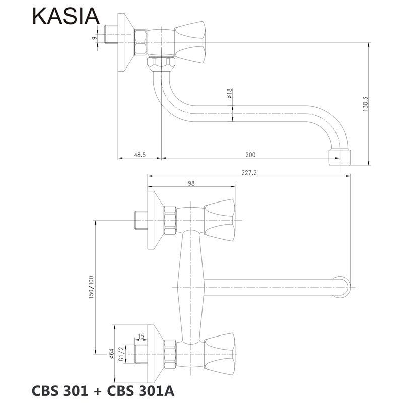 Drezová nástenná batéria, Kasia, 150 mm, s ramienkom rúrkovým ø 18 mm - 200 mm, chróm