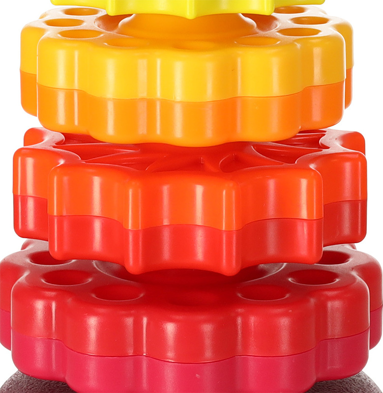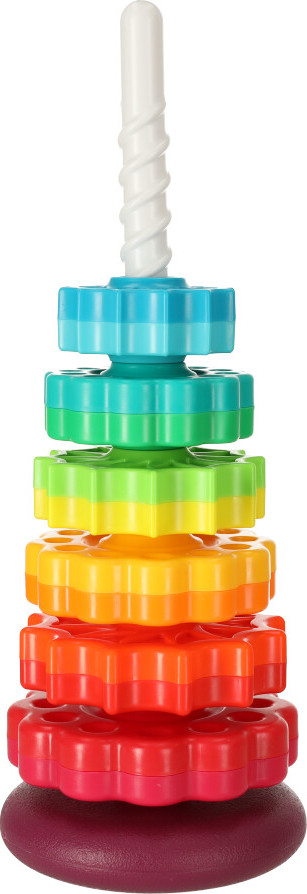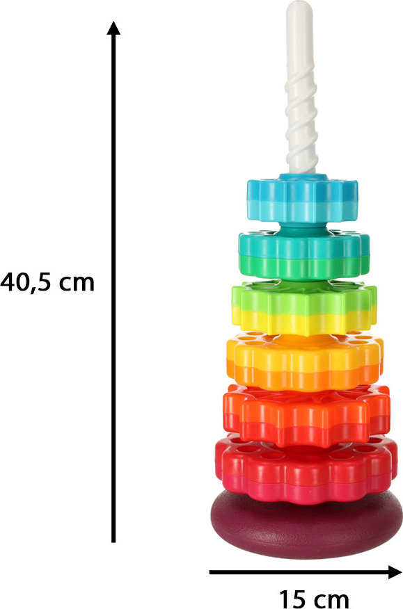 Deti milujú výrazné farby, zaujímavé textúry a pohyblivé časti – a táto hračka to všetko kombinuje! Farebná veža sa skladá z ôsmich kruhov, ktoré sú v rôznych farbách a majú rôzne vyrezávanie. Úlohou batoľaťa je nasadiť všetky kolieska na plastovú tyč, ktorá má navyše zaujímavú textúru! Kolieska kĺzajúce po tyči sa budú otáčať závratnou rýchlosťou a poskytnú vášmu dieťaťu úžasný zážitok . Kĺzajúce prvky budú tiež vydávať zaujímavý zvuk , ktorý ešte viac upúta pozornosť vášho dieťatka.