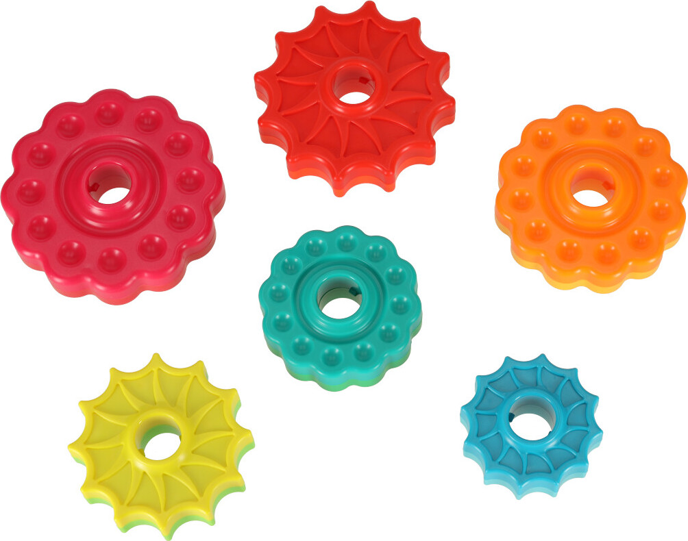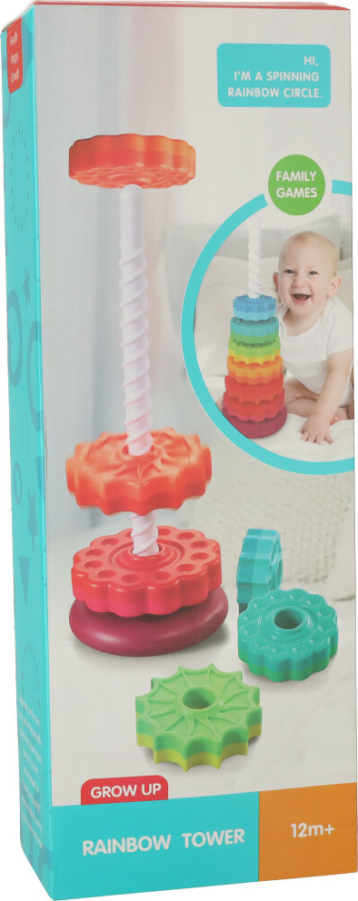 Veža poskladaná od najväčšieho kolieska k najmenšiemu predstavuje farby dúhy. Hra s kockami sa však nemusí riadiť dúhovým vzorom. Batoľa môže bloky usporiadať v ľubovoľnom poradí! Pri hre s dúhovými kolieskami sa batoľa naučí mnoho cenných zručností . Predovšetkým sa výrazne zlepšia jeho manuálne zručnosti, pretože zdvíhanie, presúvanie a odstraňovanie koliesok bude výborným tréningom pre jeho malé ručičky. Dúhová veža bude mať tiež veľký vplyv na intelektuálne zručnosti, ako je uvažovanie o príčinách a následkoch, logické myslenie a predstavivosť. Prvky rôznych farieb budú tiež dobrou príležitosťou naučiť sa rozlišovať a pomenovávať farby . Rôzne textúry, živé farby a zaujímavé posuvné zvuky kociek budú mať veľký vplyv na zmysly batoľaťa - zrak, sluch a hmat! Vďaka tomu, že každý dielik je veľký, je sada vhodná aj pre tých najmenších. Presnejšie povedané pre každé batoľa staršie ako jeden rok!