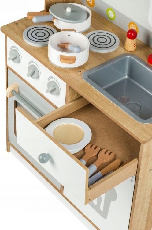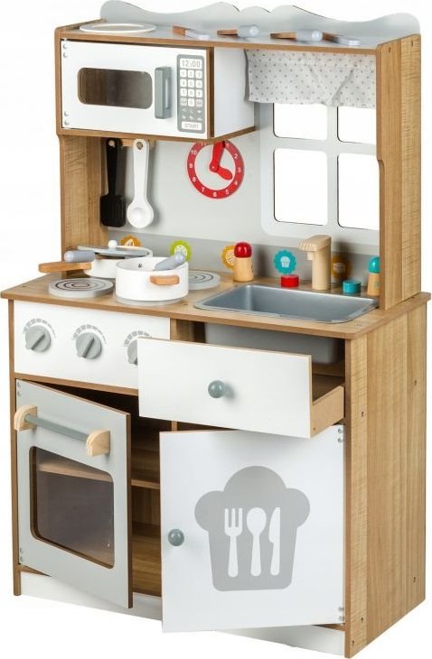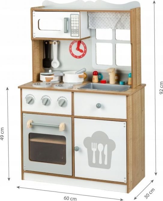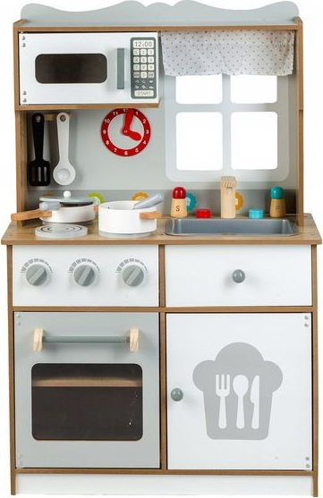 Detská útulná kuchynka od značky ECOTOYS je vhodná pre každého malého kuchára alebo kuchárku! Kuchynka je vyrobená z kvalitného dreva. Súčasťou kuchynky je sporák so 4 platničkami, rúra, mikrovlnná rúra, drez s kohútikmi odlišné podľa farby, úložný a odkladací priestor. Deti sa môžu pri varení pozerať z okna so záclonkou, ktoré je súčasťou kuchynky. Na stene kuchynky visí hodiny. Obsahuje doplnky ako je hrniec, panvica s pokrievkou, príbory, 2 taniere, naberačka, obracačka, dózičky na korenie a soľ. Rozmery kuchynky: 60 x 30 x 93,5 cm. Upozornenie: Výrobok je dodávaný v demontovanom stave. Pri zostavovaní postupujte podľa priloženého obrázkového návodu. Montáž smie vykonávať iba dospelá osoba. Na montáž je potrebný skrutkovač (nie je súčasťou balenia).Vlastnosti