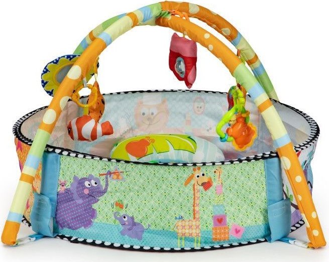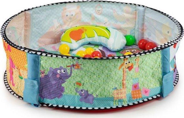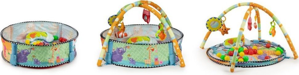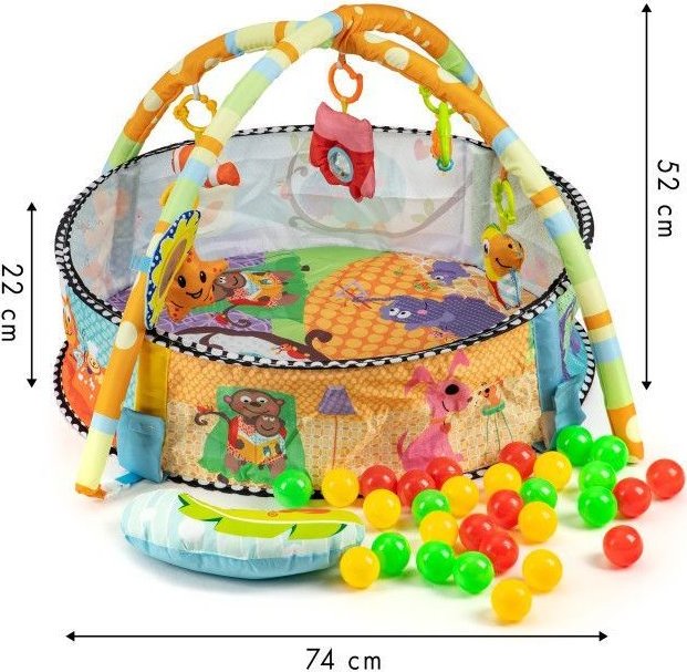 Vzdelávacia podložka je vyrobená z príjemného mäkkého materiálu vhodného pre deti. Súprava obsahuje farebné hračky zavesené na hrazde, ktorá je tiež súčasťou, rovnako ako farebné loptičky. Boky podložky je možné zdvihnúť a vytvoriť tak suchý bazén. Pestrofarebné prevedenie a výber závesných hračiek výrazne stimulujú zmysly a motorické schopnosti. Vďaka svojim kvalitám ďalej rozvíja hmat, zrak, koordináciu a pohyblivosť prstov. Výhody výrobku - vhodné pre deti od narodenia - látkový domček na úschovu hračiek - dve odnímateľné hrazdičky s hračkami (možno odňať) - na dotyk príjemný kvalitný materiál, možnosť prania Parametre - rozmery 100 x 95 x 45 cm - váha 1,2 kgVlastnosti