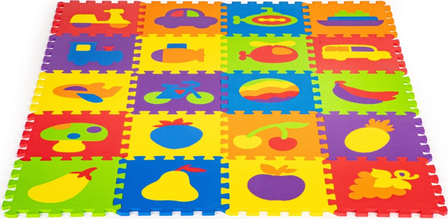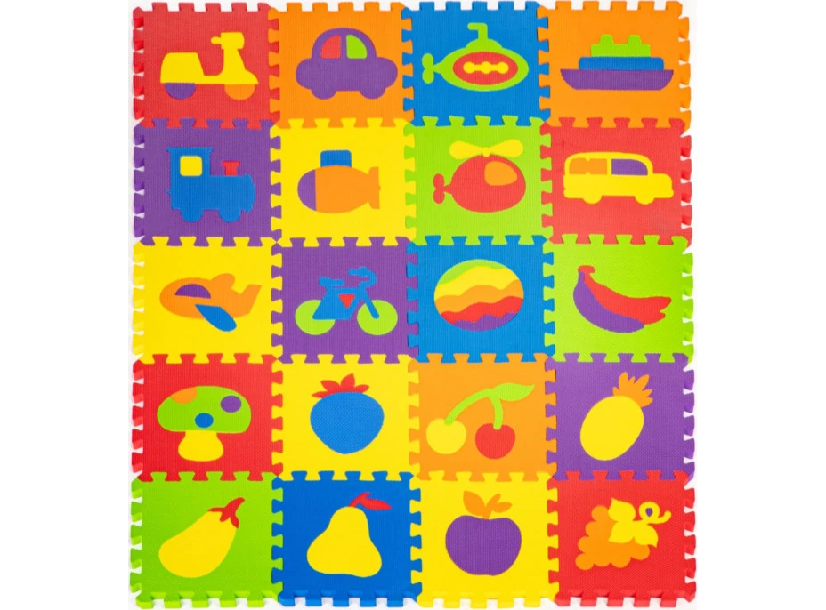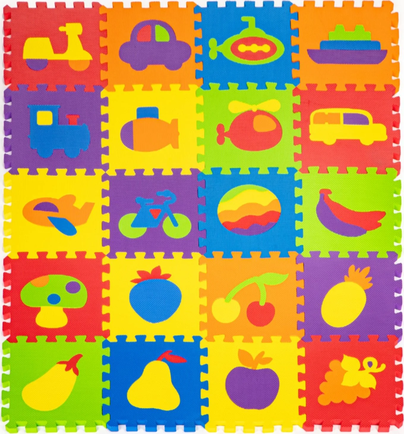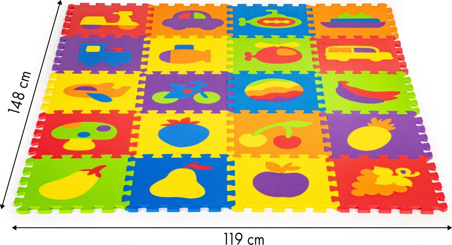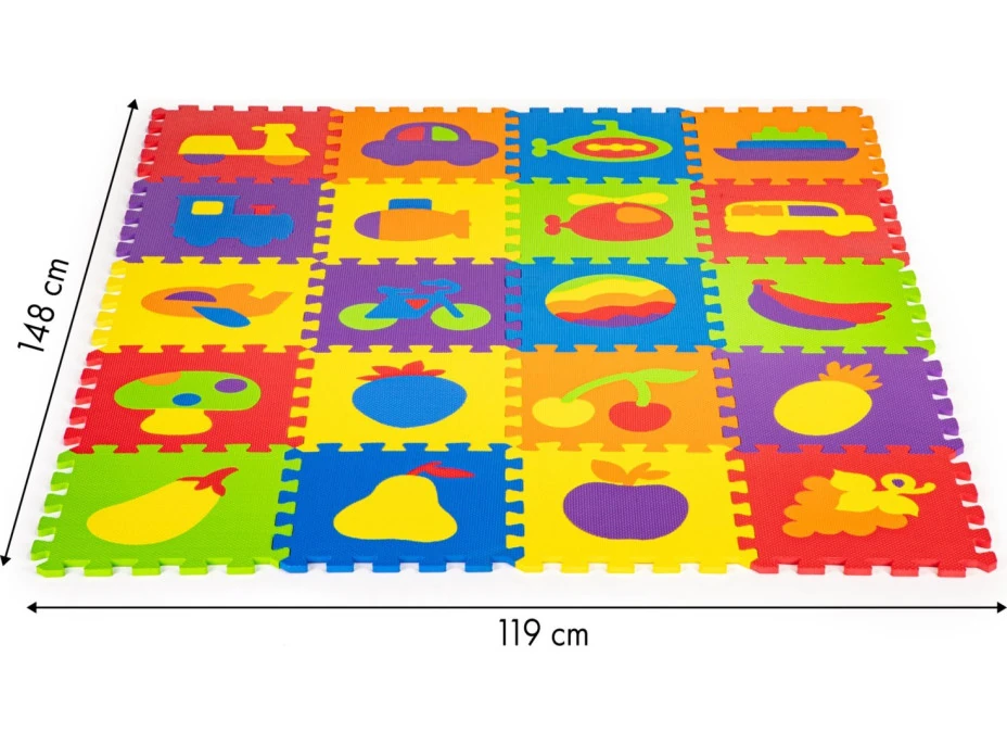 Penové puzzle s motívom dopravných prostriedkov a ovocia pre deti od 3 rokov. Puzzle má vrúbkovaný povrch av každom dieliku sú vyberateľné dieliky. Bezpečná a mäkká podložka je umývateľná, tlmí hluk a izoluje od chladu, je preto ideálna ako hrací koberec nielen do detských izieb. Hrúbka penového puzzle je 0,9 cm. Veľkosť jedného dielu je 29 x 29 cm (merané od zuba po výrez) Rozmer zloženého puzzle cca 148 x 119 cmVlastnosti