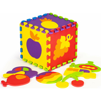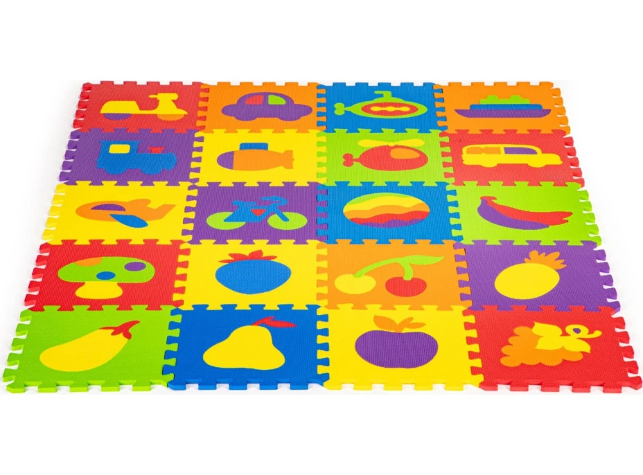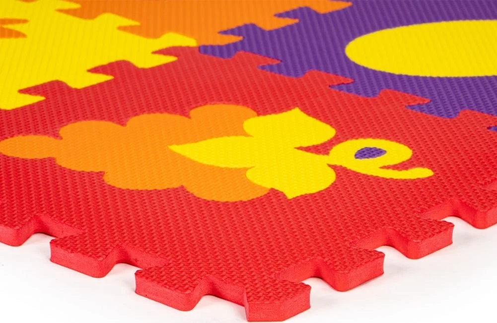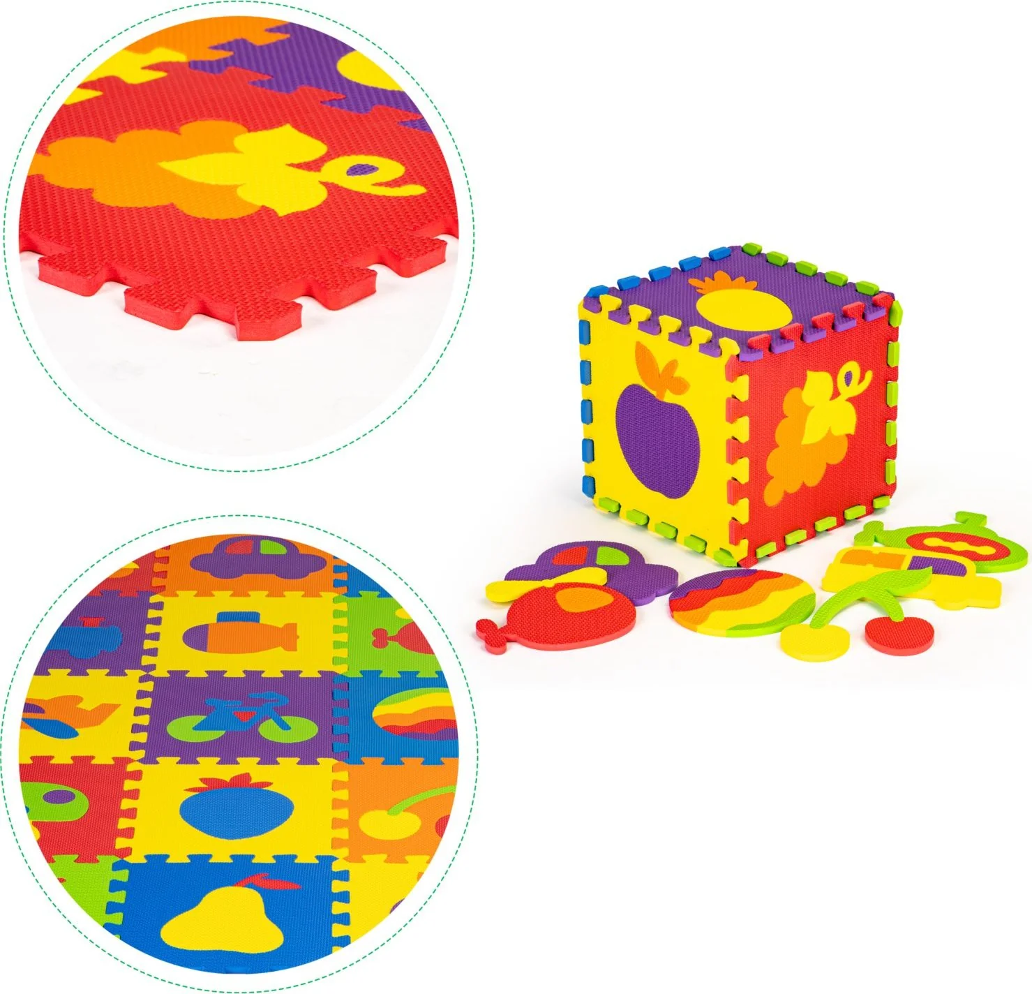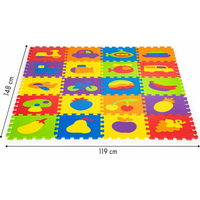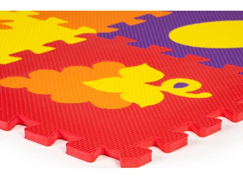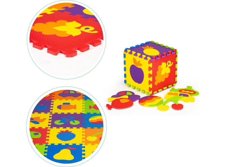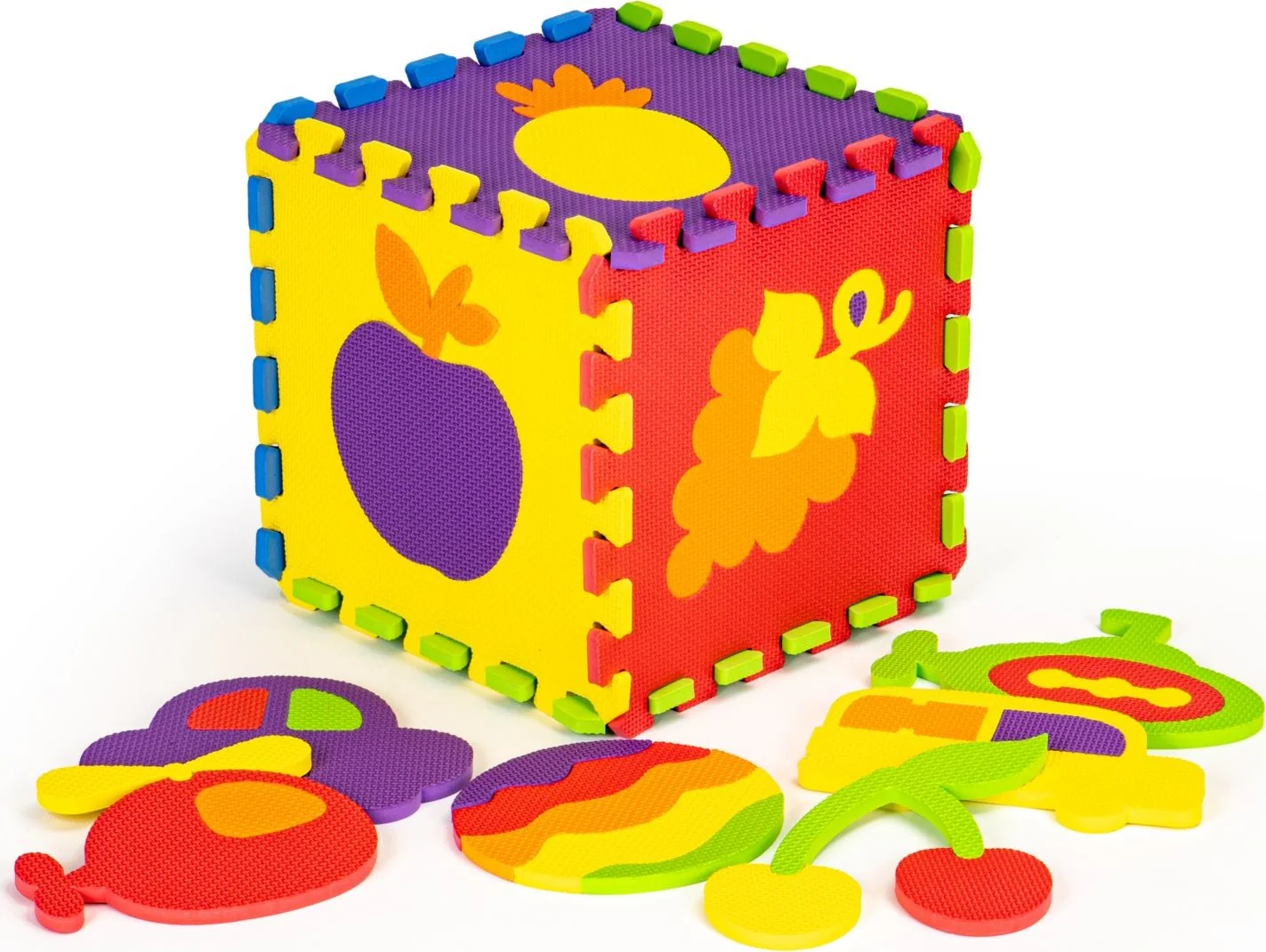 Penové puzzle s motívom dopravných prostriedkov a ovocia pre deti od 3 rokov. Puzzle má vrúbkovaný povrch av každom dieliku sú vyberateľné dieliky. Bezpečná a mäkká podložka je umývateľná, tlmí hluk a izoluje od chladu, je preto ideálna ako hrací koberec nielen do detských izieb. Hrúbka penového puzzle je 0,9 cm. Veľkosť jedného dielu je 29 x 29 cm (merané od zuba po výrez) Rozmer zloženého puzzle cca 148 x 119 cmVlastnosti