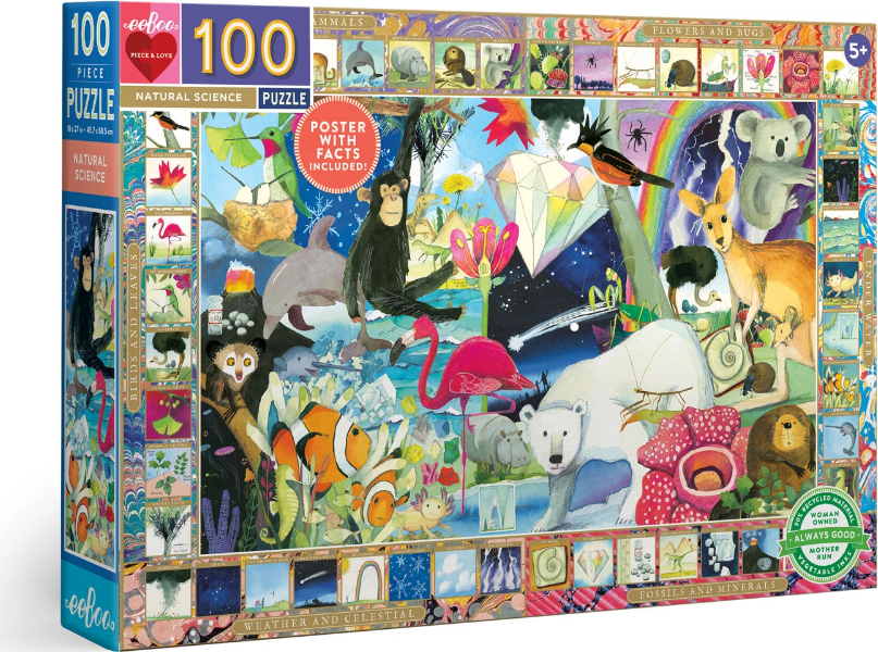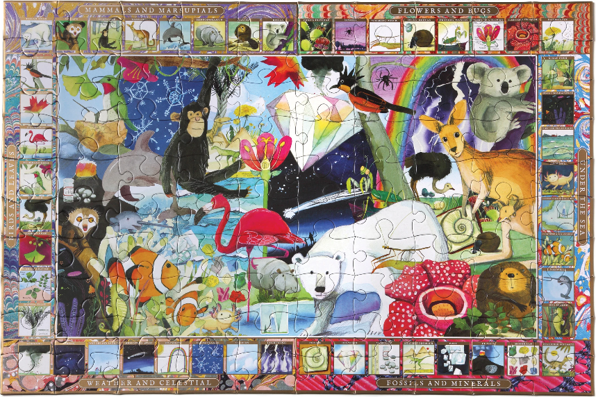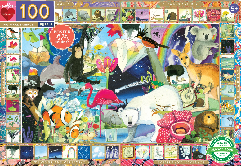 Nájdite vedľa seba podmorské živočíchy, hrocha, opičku, klokana, krásne rastliny aj stromy a tiež striedajúce sa počasie. Súčasťou balenia je aj plagát s rôznymi faktami. Materiál: vyrobené z 90% recyklovaného šedého kartónu a tlačené atramentmi na rastlinnej báze. Puzzle od amerického výrobcu EEBOO. Vhodné pre deti od 5 rokov. Rozmer zloženého puzzle cca 68,5 x 45,7 cmVlastnosti