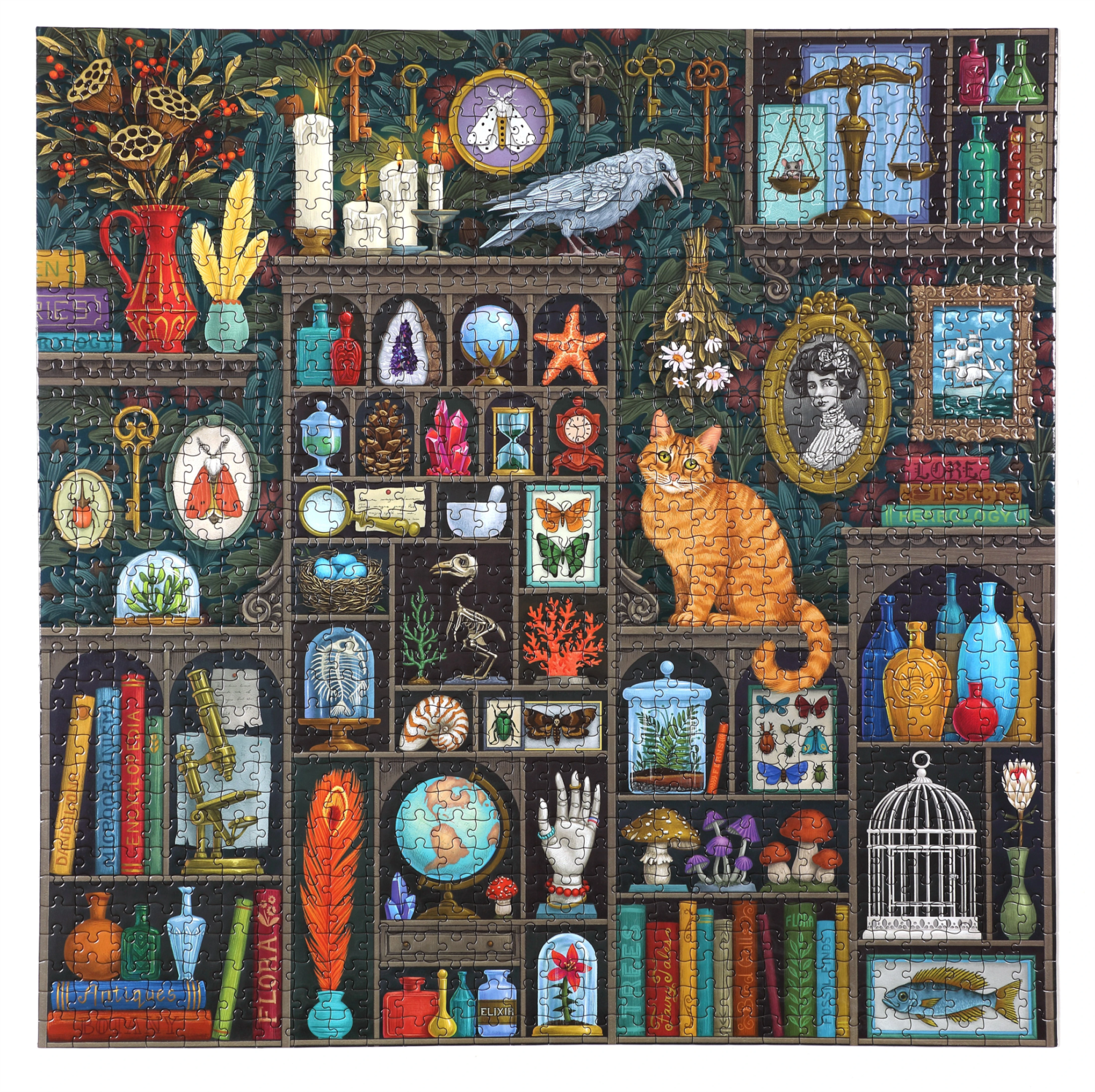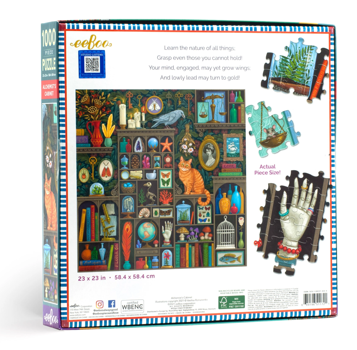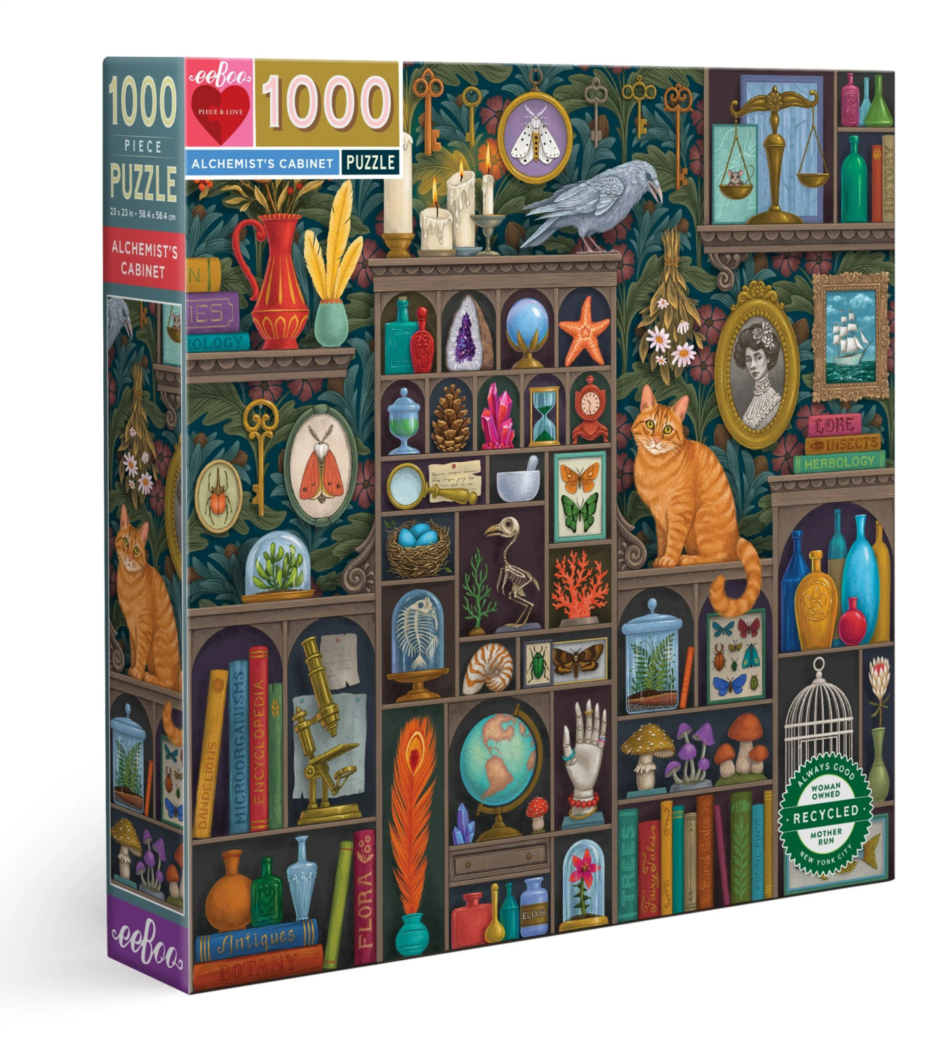 Čo nám prezradí tajomná pracovňa? Knihy, flakóny, banky, kostry a predmety dovezené z veľkých diaľok alebo zakúpené na blšom trhu umiestnené v policiach nám napovedajú, že alchymista je zvedavý a zvedavý človek, ktorý sa zaoberá prírodnými vedami a tiež mágiou, ktorá sa kedysi súhrne nazývala ALCHÉMIA - pramáti a ďalších vedeckých odborov. Skladanie tohto pestrého diela bude príjemne strávený čas. Vyrobené z 90% recyklovaného šedého kartónu a tlačené atramentmi na rastlinnej báze. Puzzle od amerického výrobcu EEBOO. Rozmer zloženého puzzle cca 58,4 x 58,4 cmVlastnosti