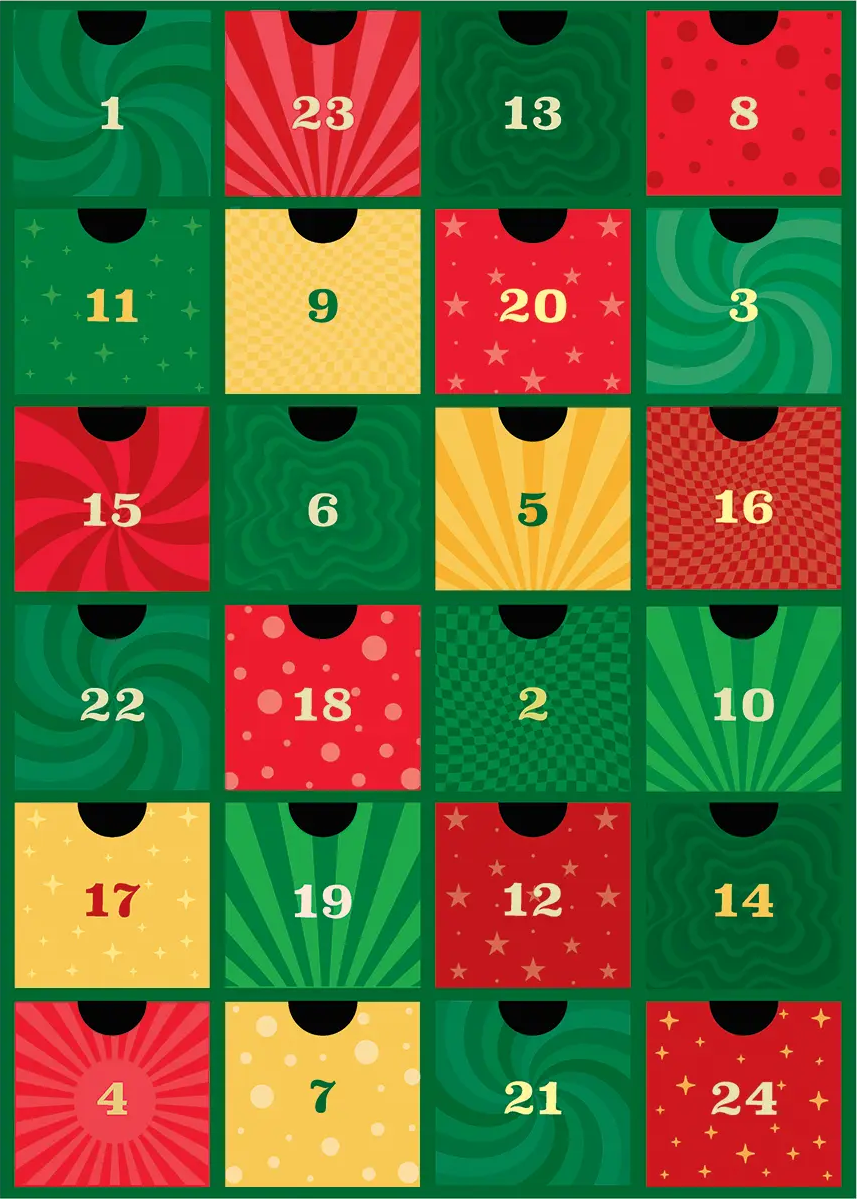 - kalendár obsahuje 24 okienok a je znovu použiteľný (na budúci rok si s jeho pomocou môžete vytvoriť originálny adventný kalendár naplnený drobnosťami alebo niečím sladkým)