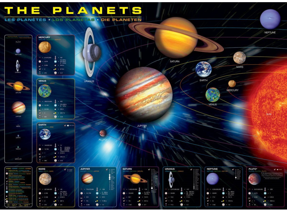 Zoznám sa s planétami Slnečnej sústavy. Dozvieš sa napr. vzdialenosť od slnka, priemer, počet mesiacov, gravitáciu, priemernú teplotu a ďalšie. Texty na puzzle sú v štyroch jazykoch: angličtina, francúzština, španielčina a nemčina. Raznice puzzle EUROGRAPHICS nekopíruje štandardnú mriežku, rohy a hrany dielikov nie sú vždy v jednej osi a dieliky majú neobvyklý tvar. Obtiažnosť puzzle je tak vyššia ako pri klasickej mriežkovej raznici, ktorú používajú poprední výrobcovia v Európe. Rozmer zloženého puzzle cca 67,63 x 48,89 cmVlastnosti