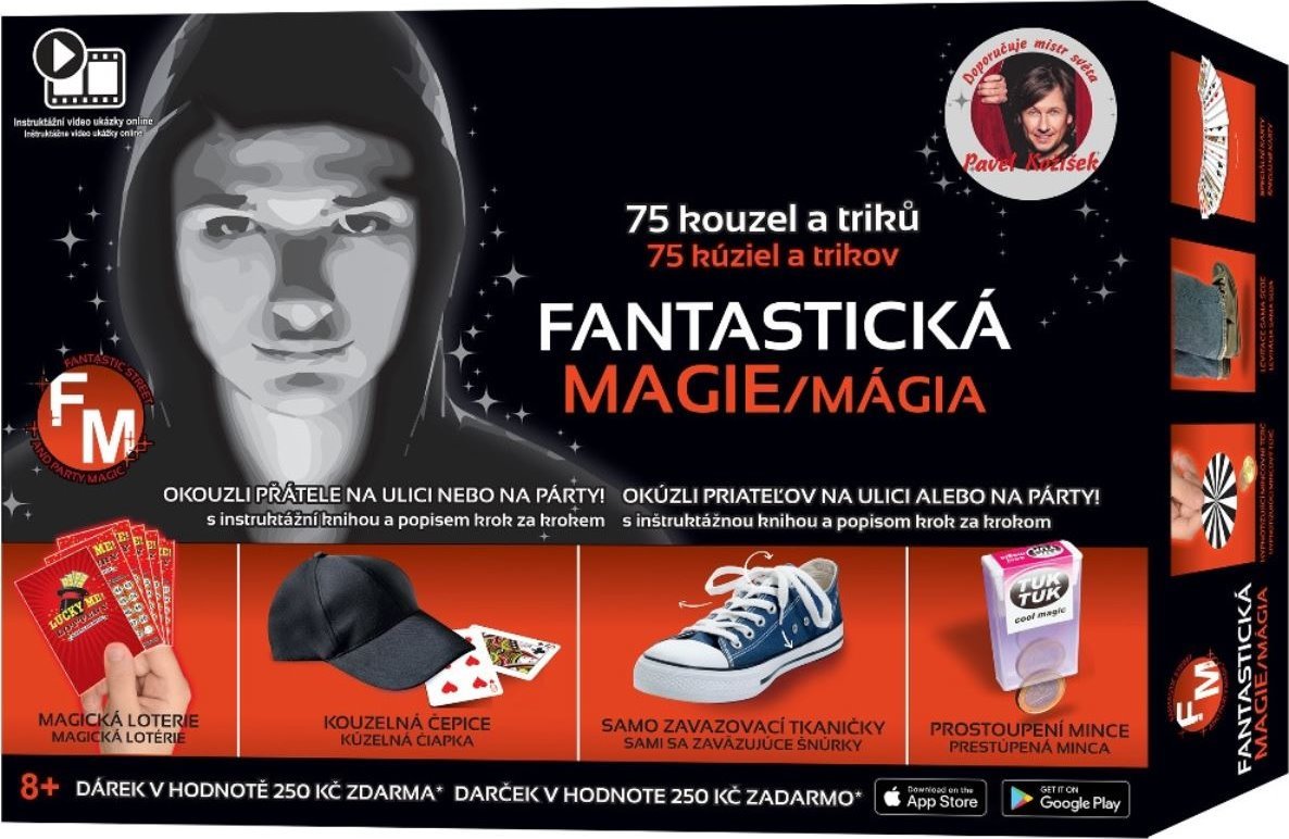 Nauč sa kúzelným trikom a ilúziám! Usporiadaj predstavenie a pobav svojich priateľov a rodinu. Sada Fantastická mágia ti dopomôže k titulu veľkého kúzelníka. Sada Fantastická mágia obsahuje: návod a pomôcky na prevedenie 75 rôznych kúzelníckych trikov - sú to - kúzelná čiapka s tajuplným príslušenstvom, kúzelnícky navijak, lietajúce kreditky, magické žreby, prestúpenie mince, bláznivé krabičky, kúzelné šnúrky, neviditeľná , samoskladacia bankovka, hypnotizujúca mincový terč, ... Balenie obsahuje aj špeciálny darček v hodnote 10 €! A tým je vstupenka do divadla kúziel Pavla Kožíška!Vlastnosti