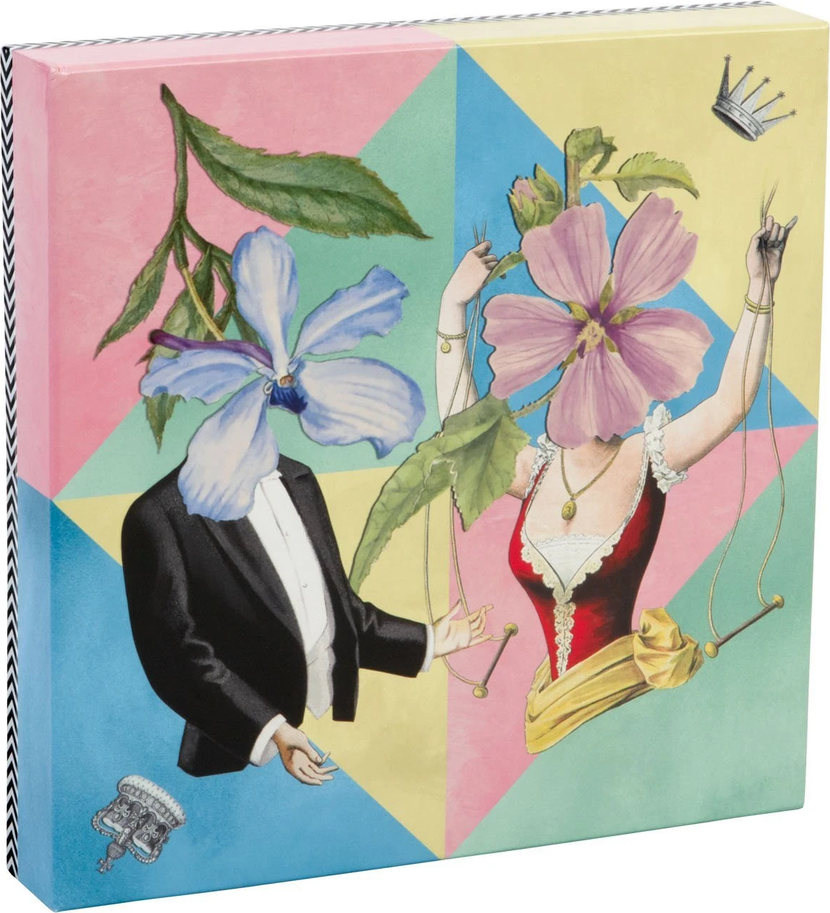 Obojstranné puzzle Christian Lacroix predstavuje dva rôzne, ale rovnako jedinečné návrhy z bujarého sveta Maison Christian Lacroix. Na jednej strane je krásne ilustrovaný kráľ a kráľovná s kvetinovými hlavami a na druhej strane pikový list s "pokrovou tvárou" uprostred dvojfarebného geometrického herného plánu. Puzzle má z oboch strán lesklý povrch, vnútorná časť krabičky je potlačená. Rozmer zloženého puzzle cca 50,8 x 50,8 cmVlastnosti