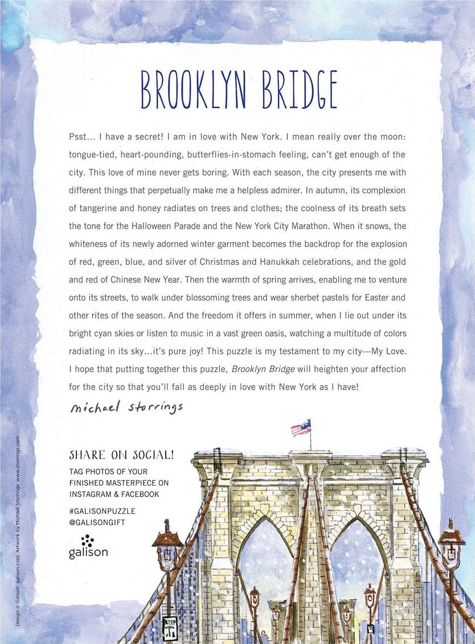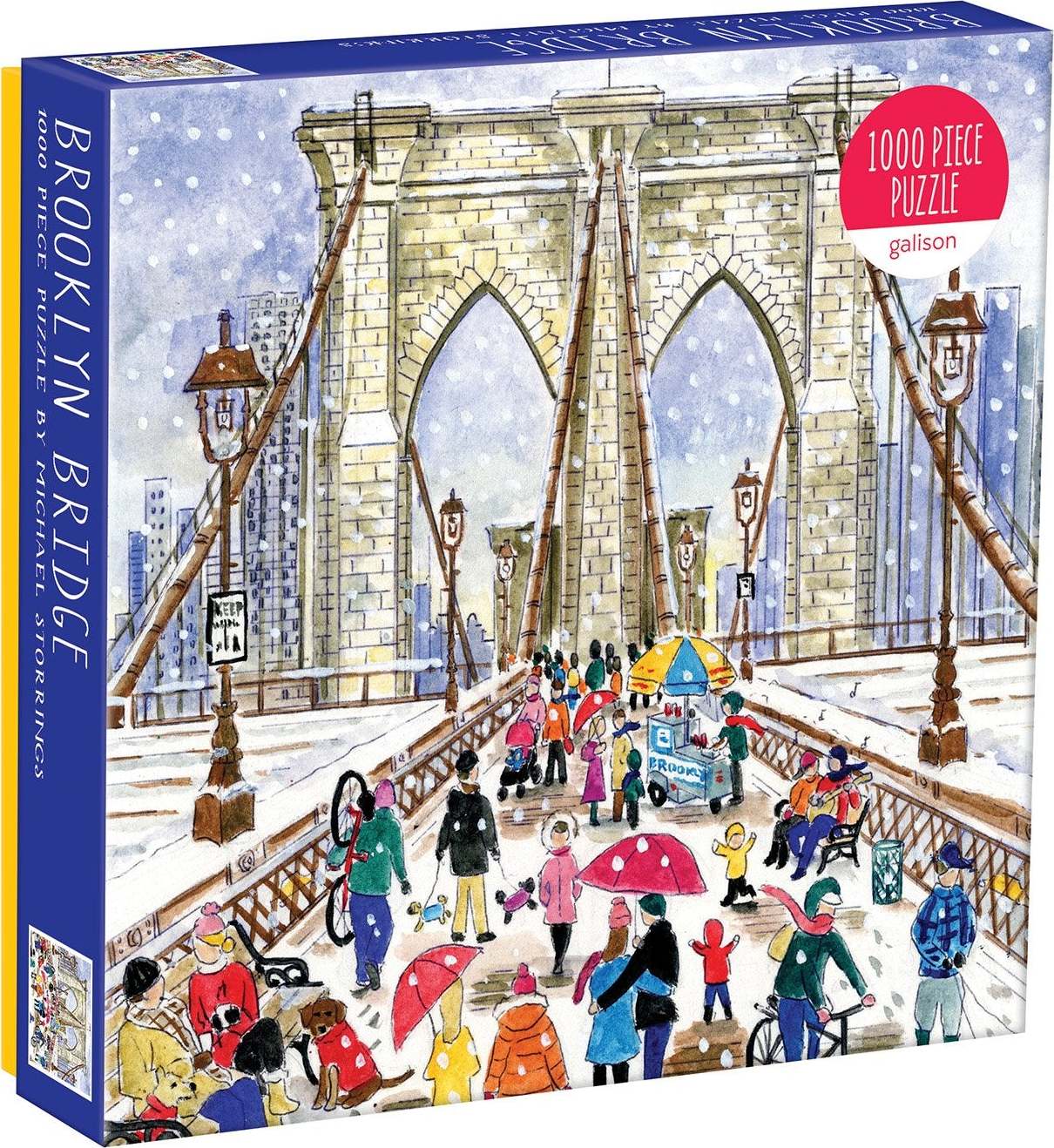 Oceňovaný dizajnér, ilustrátor a kreatívny riaditeľ Michael Storrings zachytáva podstatu slávneho newyorského Brooklynského mosta v zime. Puzzle je balené v pevných škatuliach s matným povrchom. Súčasťou je aj príloha s celým obrázkom puzzle.