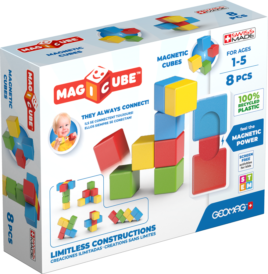 Stavebnica Magicube Try Me vám ponúka možnosť vyskúšať magnetizmus v praxi a pozýva vás do sveta stavieb vytvorených z našich magnetických kociek Geomag. Tie sú vyrobené zo 100% recyklovaného plastu, s rešpektom k našej planéte a životnému prostrediu. Stavebný systém tejto inovatívnej hračky je tvorený magnetickými kockami, ktoré sa k sebe navzájom priťahujú zo všetkých šiestich strán. Využitím neviditeľných síl magnetizmu môžu deti popustiť uzdu svojej fantázie pri vytváraní farebných 3D modelov. Hrou s magnetickými kockami si aj tie najmenšie deti začnú rozvíjať svoje prvé manuálne zručnosti, stavať veže aj učiť sa farby.Vlastnosti