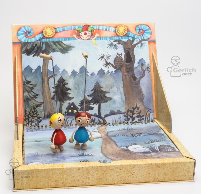 - knižné divadlo obsahuje 4 drevené bábky a 4 scény k rozprávke O perníkovej chalúpke