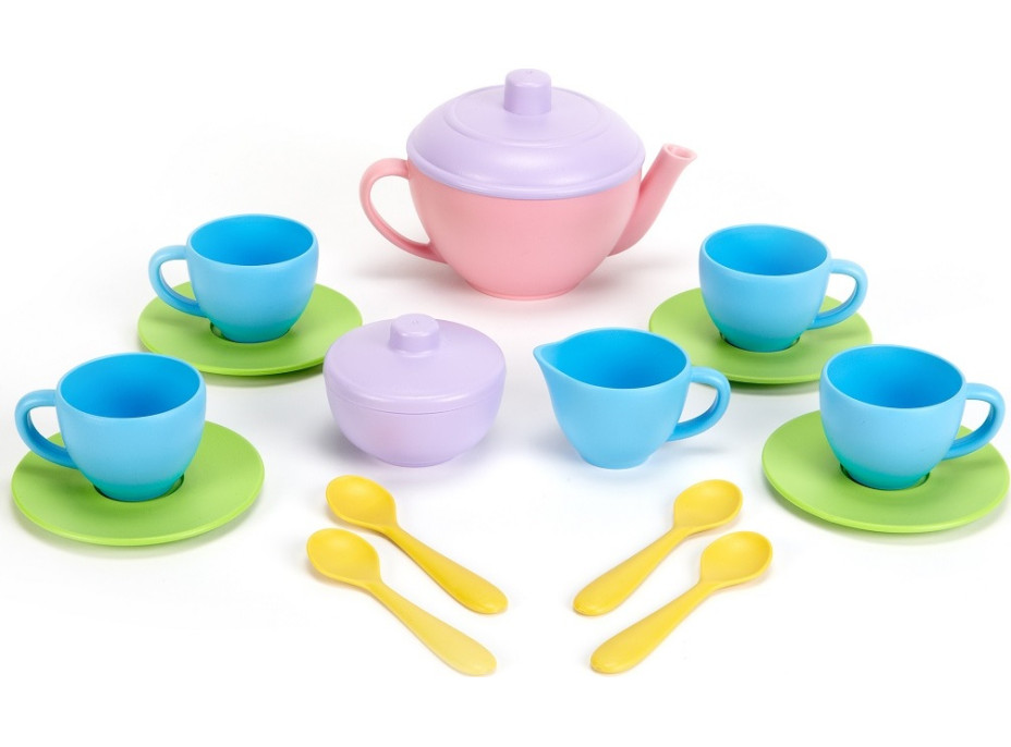 Čajový večierok pre štyri. Dajte si zelený čaj s touto ekologickou hračkou od Green Toys. Budete sa starať nielen o dušu, ale aj o planétu. Čajová sada z pevného recyklovaného plastu sa skladá zo 17 dielikov, v balení nájdete ružovú čajovú kanvičku, cukorničku, 4 šálky, 4 podšálky a 4 lyžičky. Hračka je vyrobená zo 100% recyklovaných materiálov, je netoxická, neobsahuje BPA, PVC, ftaláty, ani vonkajší náter. Vhodné na umývanie v umývačke.