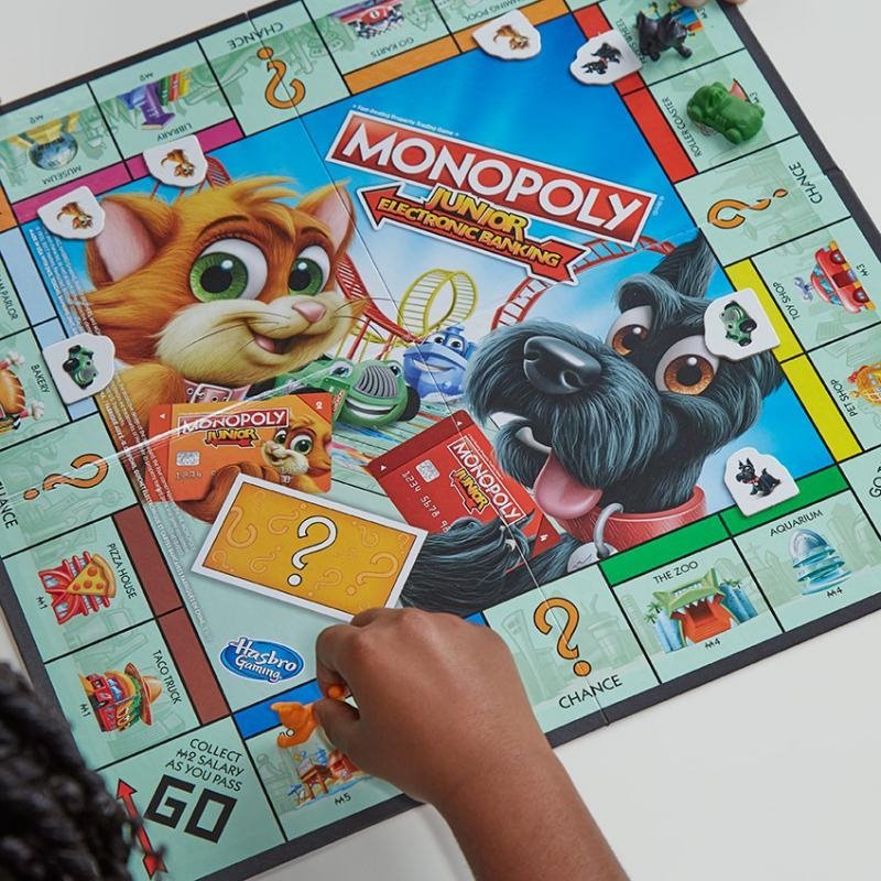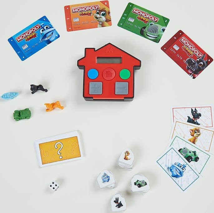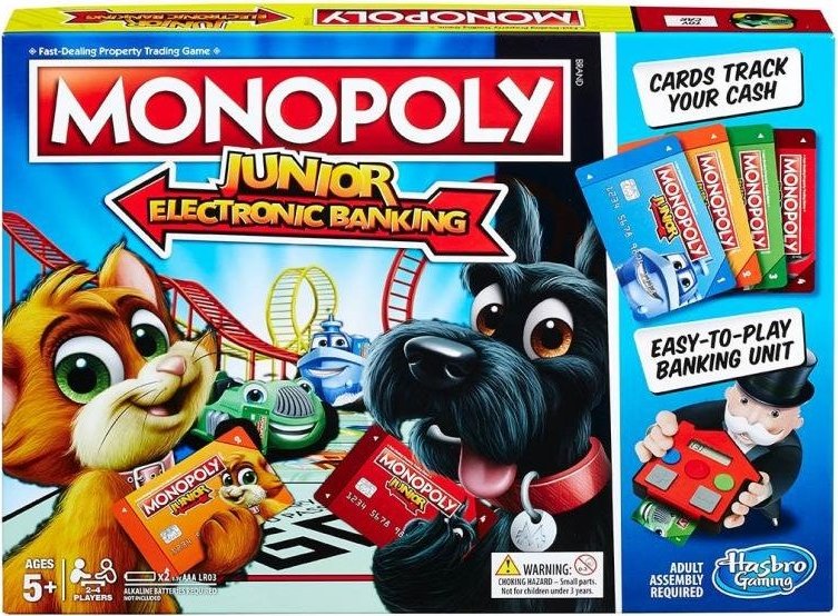 Obľúbená hra v novom prevedení Monopoly Junior Elektronic Banking prináša deťom moderný bankový zážitok. Peniaze sú tu nahradené jednotkou elektronického bankovníctva a bankovými kartami. Použite platobné karty na nákup nehnuteľností, platenie nájomného a zhromažďovanie peňazí. V hre nájdete 4 obľúbené figúrky: Little Hazel, Little Scottie, Toy Car a Toy Boat. Posúvajte svoje žetóny po hernom pláne a nakupujte atrakcie a budovy, ako je zmrzlinový palác, hračkáreň alebo skate park. Užite si veľa zábavy pri nakupovaní a umiestňovaní cedúľ "Predané" u vami kúpenej nehnuteľnosti! Staňte sa víťazom a najbohatším hráčom novej hry Monopoly Junior Electronic Banking! Vhodné pre deti od 5 rokov. Prevádzka na 2 batérie typu AAA (nie sú súčasťou balenia).Vlastnosti