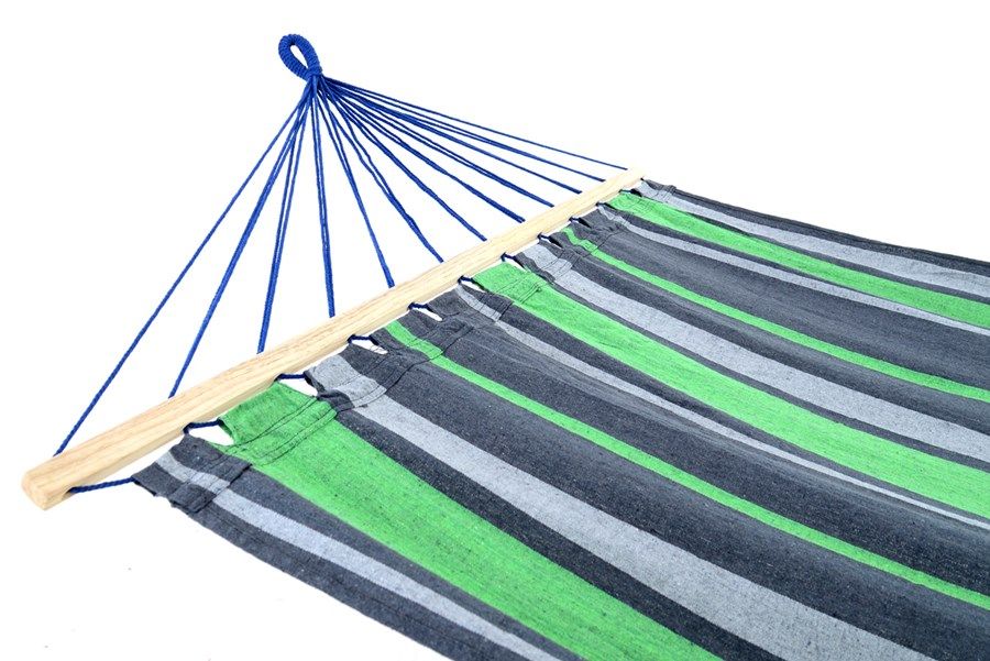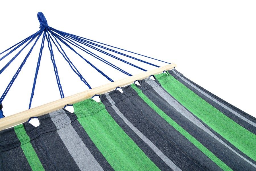 Táto pohodlná hojdacia sieť je vyrobená zo spleteného textilného vlákna, dvoch bočníc z tvrdého bukového dreva a dvoch ôk na koncoch siete k jednoduchému ale bezpečnému uchytenie.