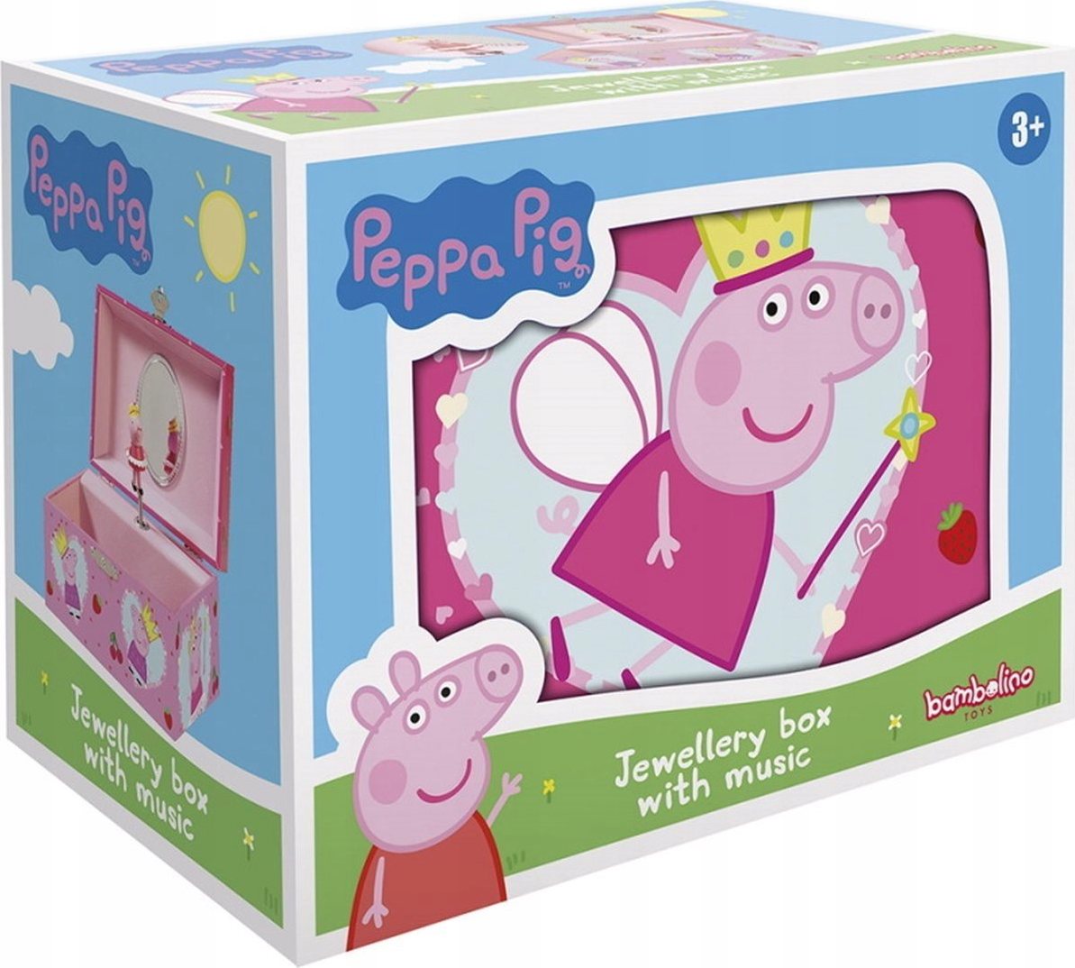 Roztomilá hracia šperkovnica s motívom Prasiatka Peppy, ideálna na uloženie detských šperkov a pokladov. Pri otvorení sa spustí melódia a figúrka sa môže otáčať. Box slúži na ukladanie šperkov, drobností alebo detských pokladov. Skrinka hrá po natiahnutí kovovej kľučky na zadnej strane výrobku.