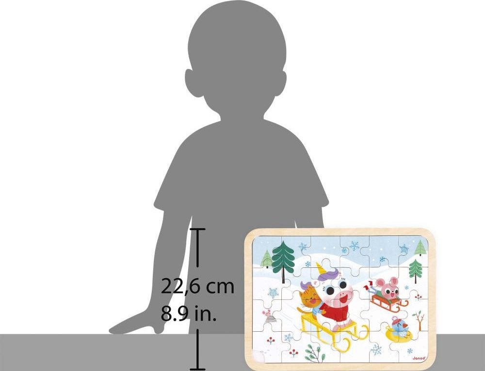 Detské puzzle z dreva s motívom zimných radovánok. Dieliky sú umiestnené na drevenej doske s vyfrézovaným okrajom na uľahčenie skladania. Skladanie puzzle rozvíja fantáziu a podporuje rozvoj motoriky. Po poskladaní obrázku nájdi rozdiely v predlohe.