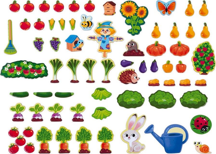 Zábava s magnetmi! Magnetická tabuľa Moja záhrada na zavesenie, na ktorú si deti môžu pripevňovať krásne magnetky so všetkým, čo nájdeme v záhradke. Deti sa vďaka tabuľke naučia, čo všetko sa dá v záhradke pestovať. Záhradku si môžu zalievať, aby im zelenina dobre rástla, aj strašiaka treba svedomito umiestniť, aby zaplašil všetkých škodcov. V balení nájdete aj magnetky zvieratiek, s ktorými sa deti môžu hrať a zároveň sa naučiť, čo všetko jej napríklad králik. Súprava obsahuje 70 magnetiek. Vhodné pre deti od 3 rokov.Vlastnosti