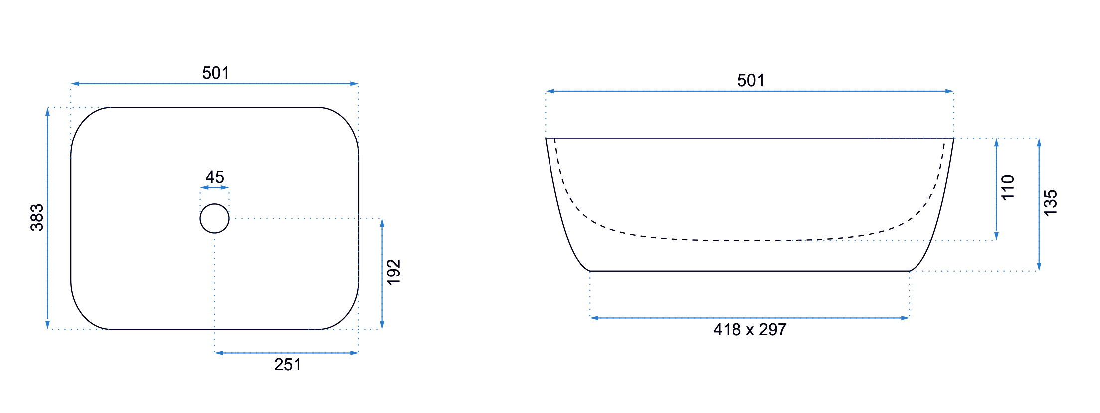 - Rozmery umývadla: 501 x 383 x 135 mm